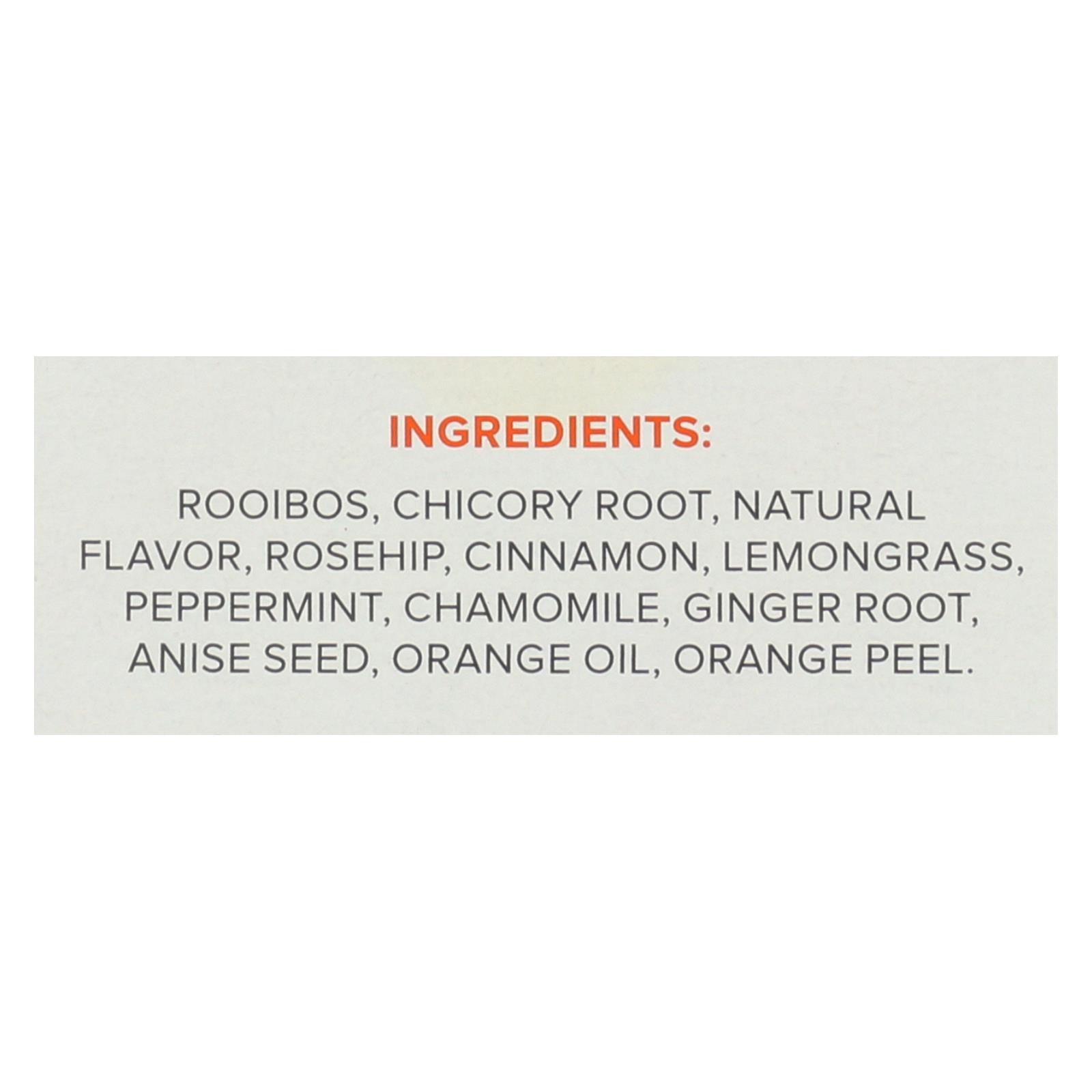 Rooibos, chicory root, natural flavor, rosehip, cinnamon, lemongrass, peppermint, chamomile, anise seed, ginger root, orange oil, orange peel.