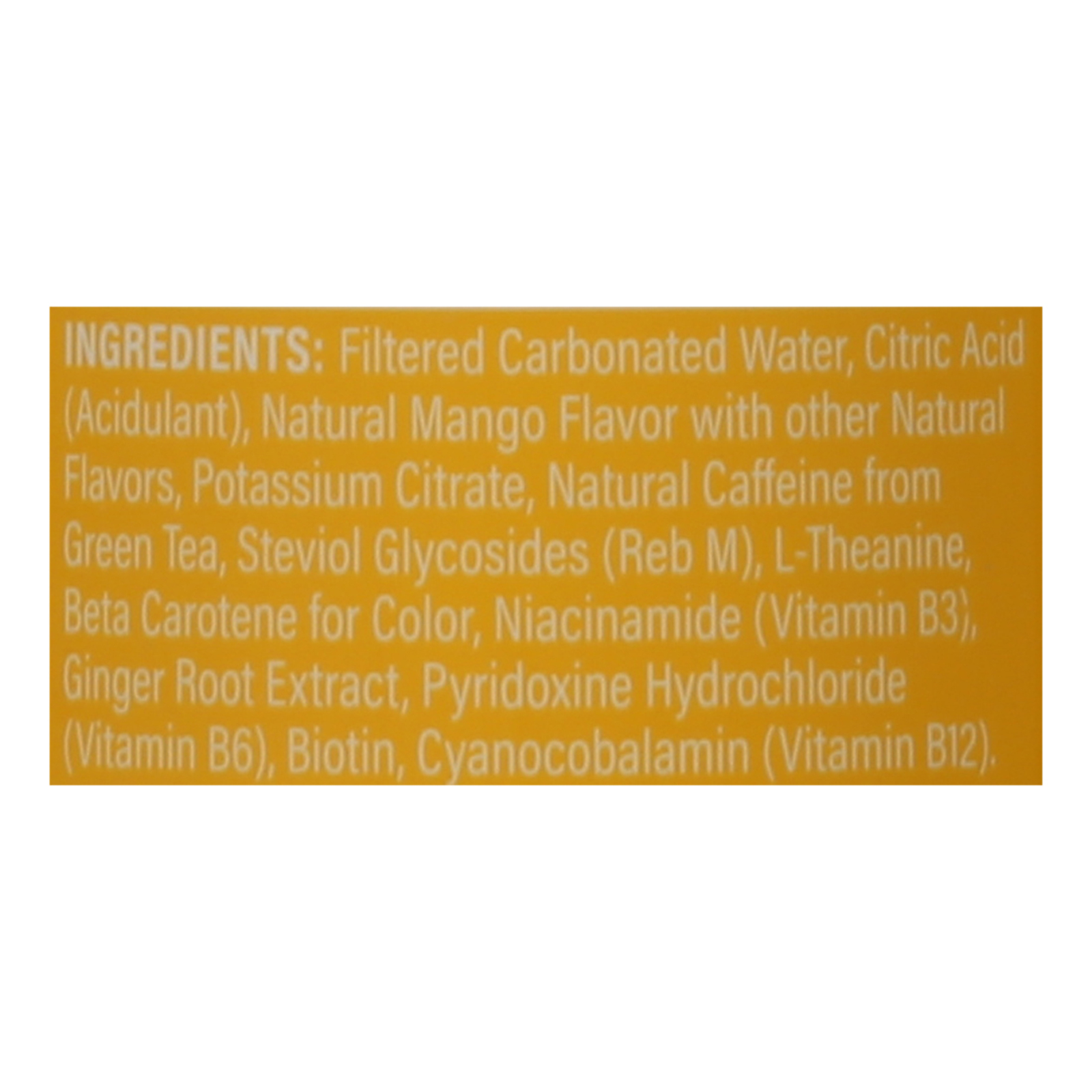 Filtered carbonated water, citric acid, natural mango flavor with other natural flavors, potassium citrate, caffeine from green tea, steviol glycosides (Reb M), L-theanine, beta carotene for color, niacinamide (vitamin B3), ginger root extract, pyridoxine hydrochloride (vitamin B6), biotin, cyanocobalamin (vitamin B12)