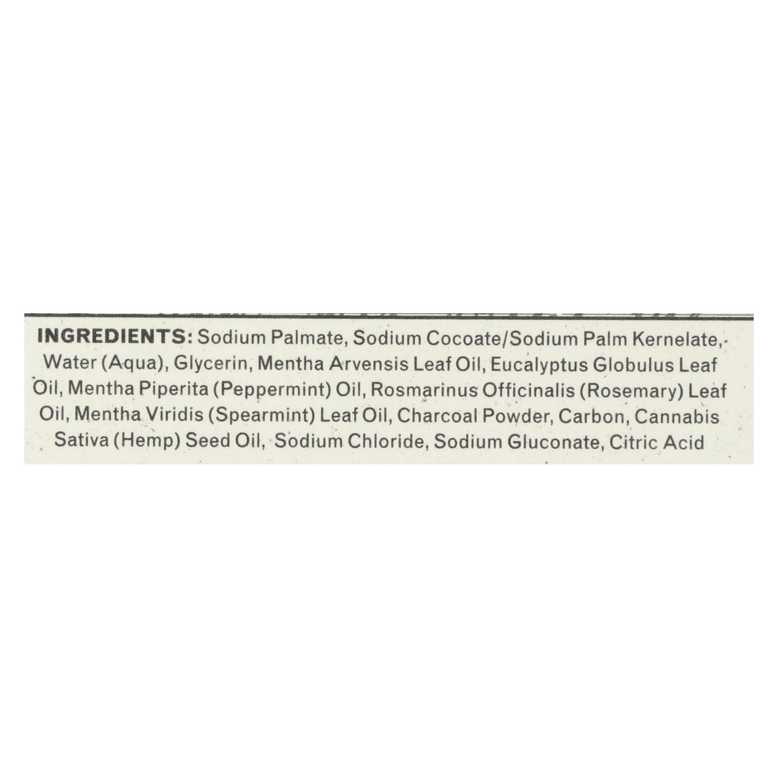 Sodium palmate, sodium cocoate/sodium palm kernelate, water (aqua), glycerin, mentha arvensis leaf oil, eucalyptus globulus leaf oil, mentha piperita (peppermint) oil, rosmarinus officinalis (rosemary) leaf oil, mentha viridis (spearmint), charcoal powder (carbon), cannabis sativa (hemp) seed oil, sodium chloride, sodium gluconate, citric acid.