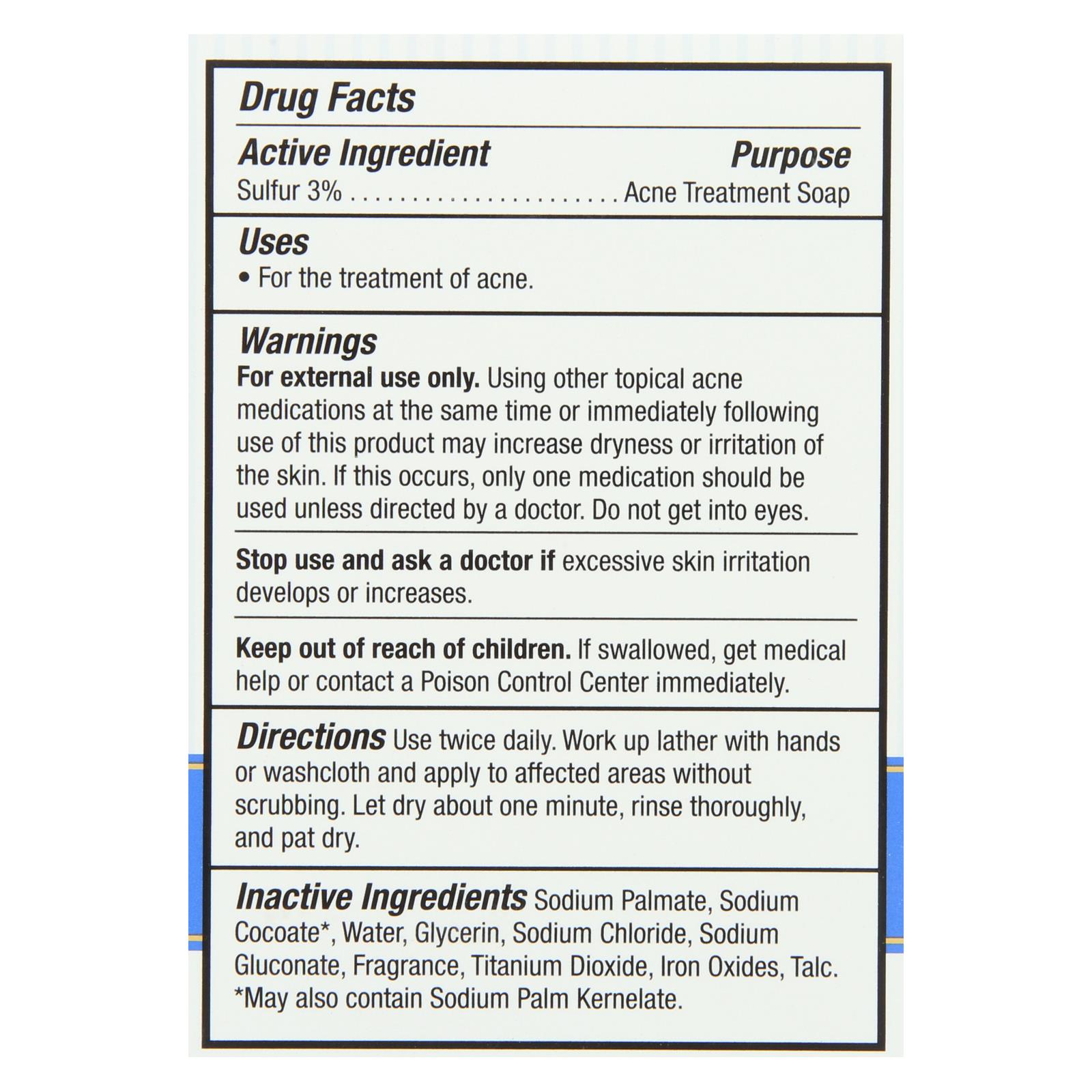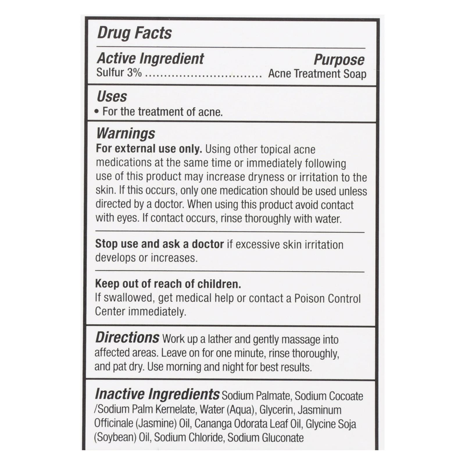ingredients : active ingredient sulfur 3% purpose acne treatment soap inactive sodium palmate;sodium cocoate/sodium palm kernelate;water;aqua;glycerin;jasminum officinale;jasmine;oil;cananga odorata leaf oil;glycine soja;soybean;sodium chloride;sodium gluconate