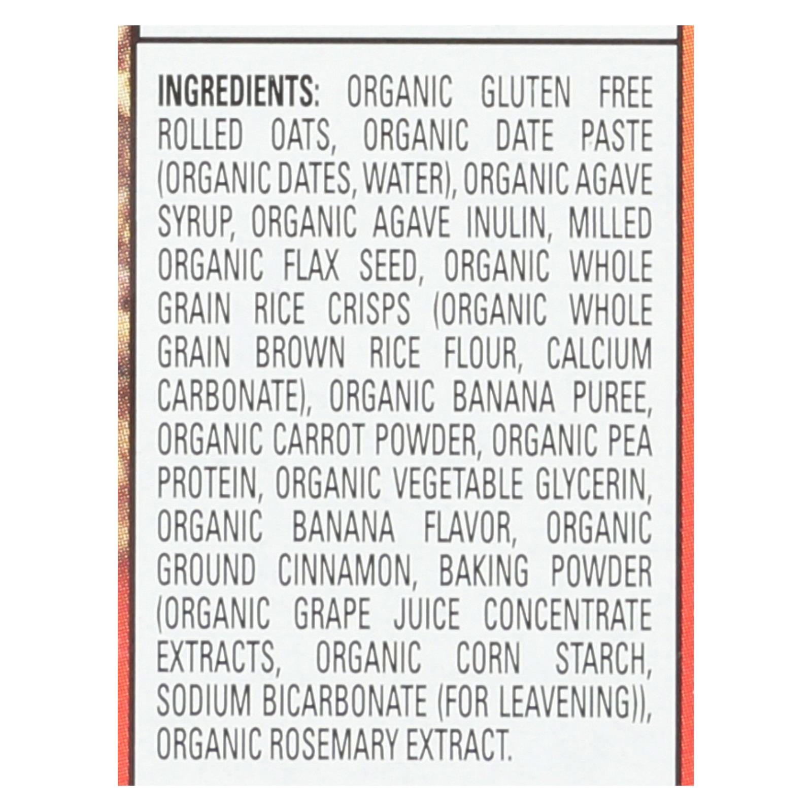 ingredients : organic whole grain rolled oats;organic date paste;organic dates;water;organic agave syrup;organic agave inulin;milled organic flaxseed;organic whole grain rice crisps;organic whole grain brown rice flour;calcium carbonate;organic banana puree;organic carrot powder;organic pea protein;organic vegetable glycerin;organic banana flavor;organic ground cinnamon;baking powder;organic corn starch;organic grape juice concentrate extracts;sodium bicarbonate;for leavening;organic rosemary extract
