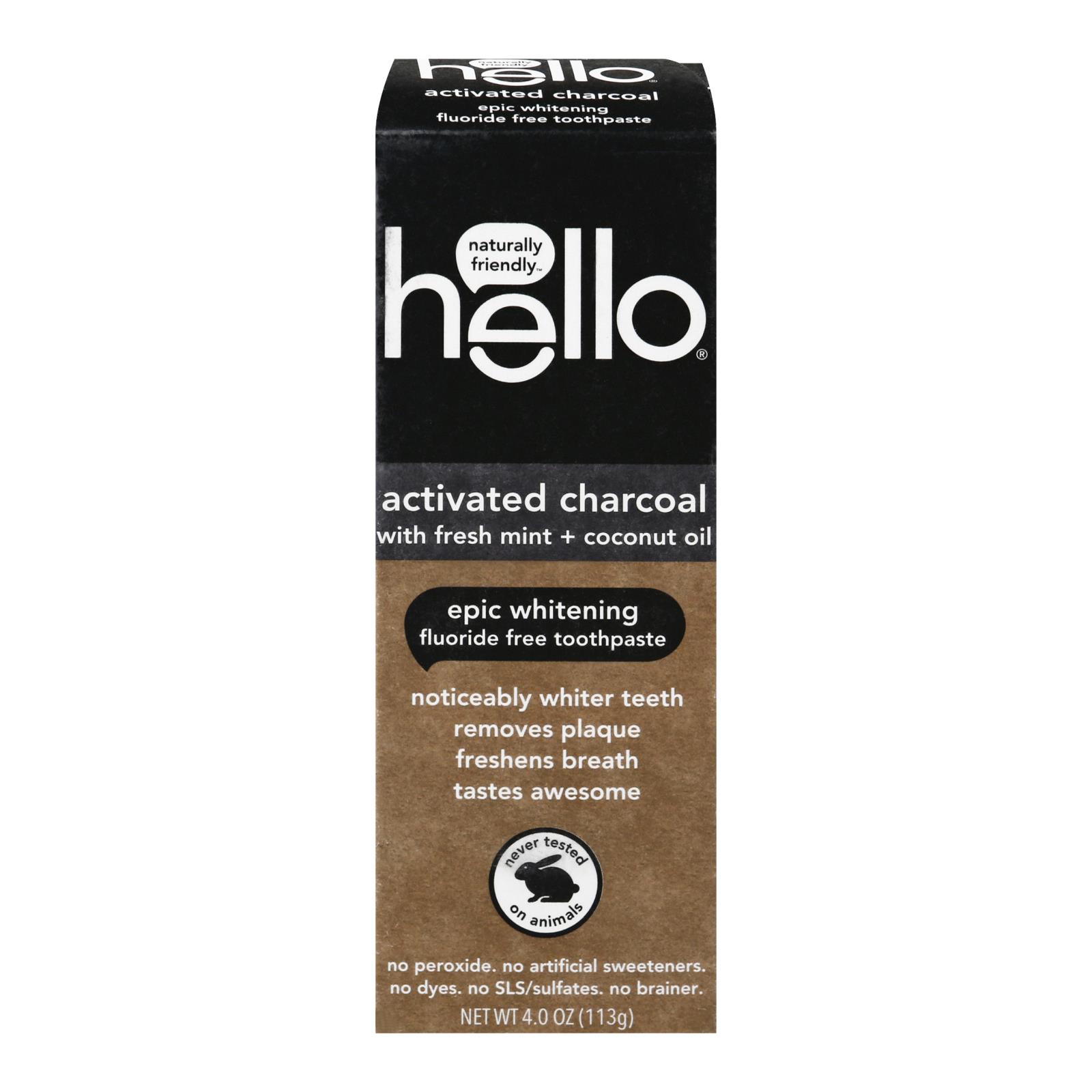 Hello Products activated charcoal toothpaste with mint and coconut oil whitens teeth, freshens breath, and is vegan, natural, and free from artificial additives