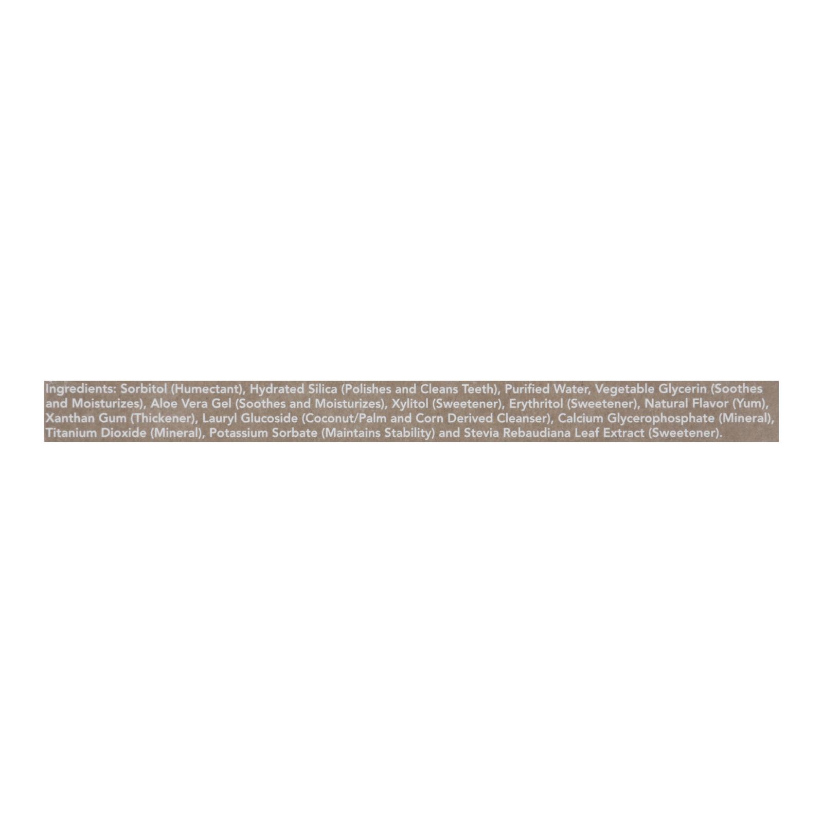 Sorbitol (humectant), hydrated silica (polishes and cleans teeth), purified water, vegetable glycerin (soothes and moisturizes), aloe vera gel, xylitol (sweetener), erythritol, natural flavor, xanthan gum (thickener), lauryl glucoside (coconut/palm and corn derived cleanser), calcium glycerophosphate (mineral), titanium dioxide, potassium sorbate (maintain stability), stevia rebaudiana leaf extract.