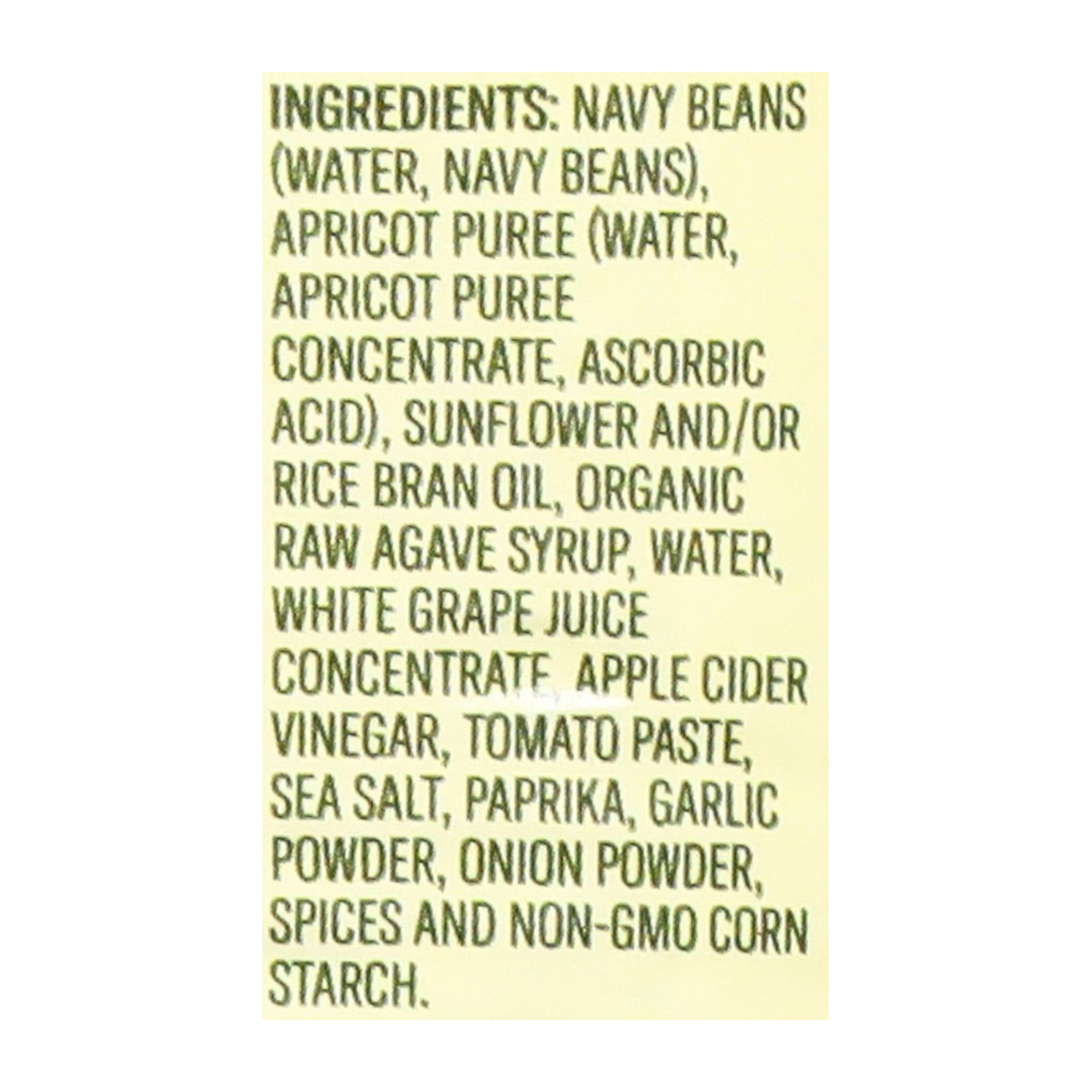 Navy beans (water, navy beans); apricot puree (water, apricot puree concentrate, ascorbic acid); sunflower and/or rice bran oil; organic raw agave syrup; water; white grape juice concentrate; apple cider vinegar; tomato paste; sea salt; paprika; garlic powder; onion powder; spices; non-GMO corn starch.