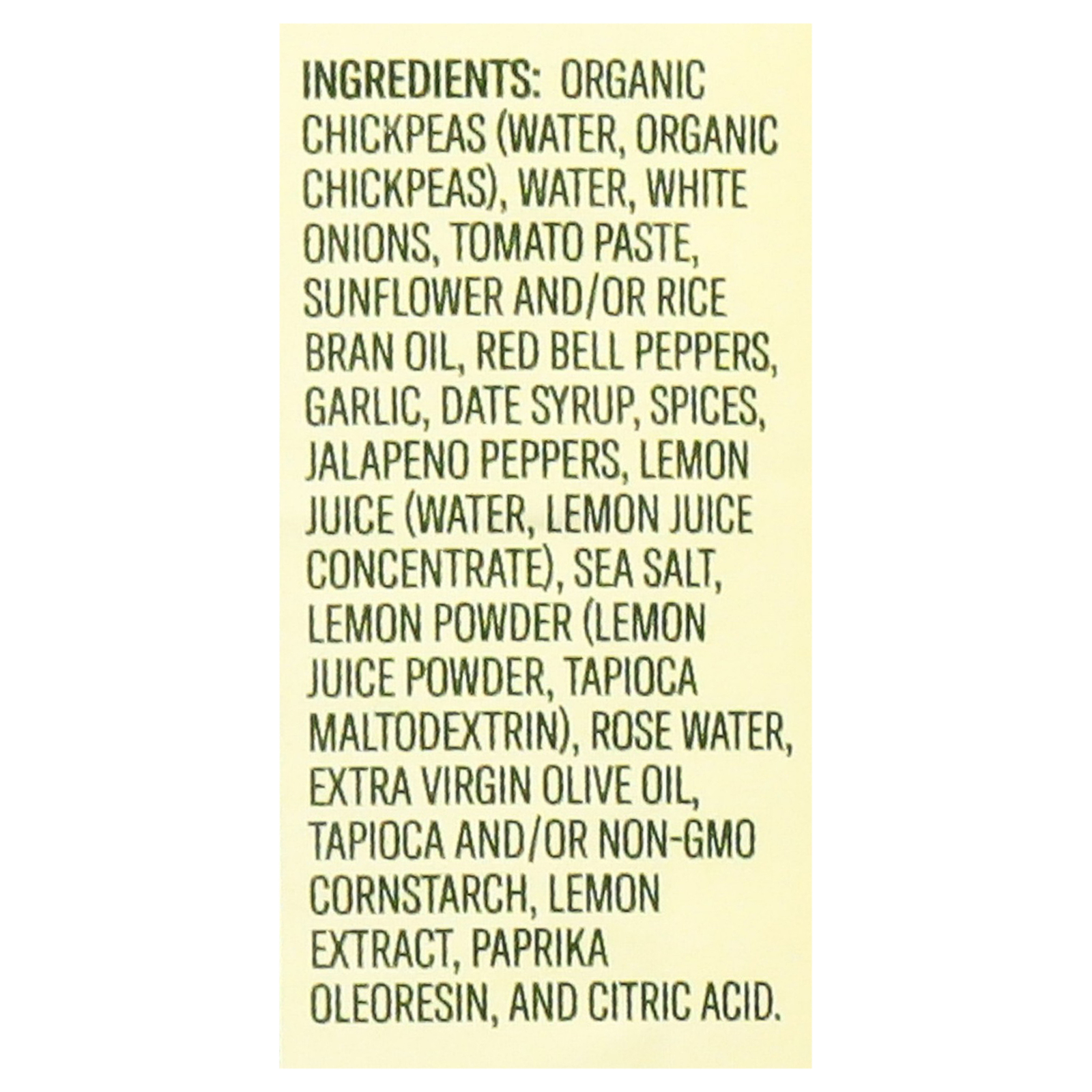 Organic chickpeas (water, organic chickpeas), water, white onions, tomato paste, sunflower and/or rice bran oil, red bell peppers, garlic, date syrup, spices, jalapeno peppers, lemon juice (water, lemon juice concentrate), sea salt, lemon powder (lemon juice powder, tapioca maltodextrin), rose water, extra virgin olive oil, tapioca and/or non-GMO cornstarch, lemon extract, paprika oleoresin, citric acid.