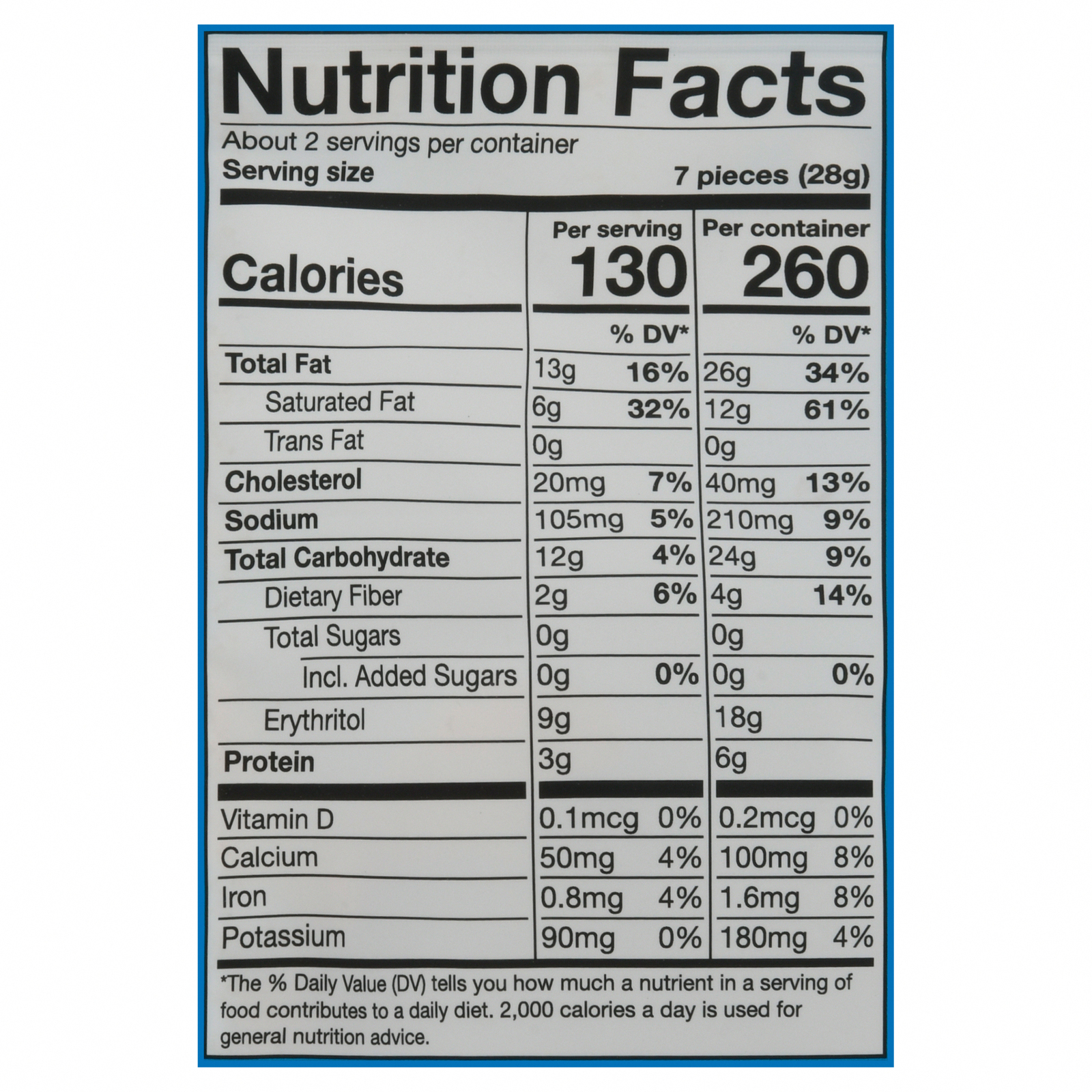 Almond flour, sweetener blend (erythritol, monk fruit extract, stevia extract [steviol glycosides]), coconut oil, chocolate chips (unsweetened chocolate, cocoa butter, stevia extract, sunflower lecithin), unsalted butter, cream (milk), dried whole eggs, natural flavor, baking powder (monocalcium phosphate, baking soda [sodium bicarbonate], cornstarch), hydrolyzed collagen, guar gum, xanthan gum, salt.