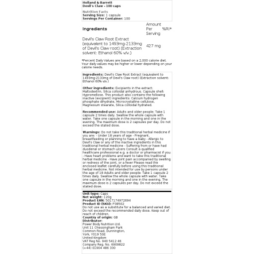 Each capsule contains 427mg of Devil’s Claw root extract. Other ingredients include gelatin (capsule shell),magnesium stearate (anti-caking agent).