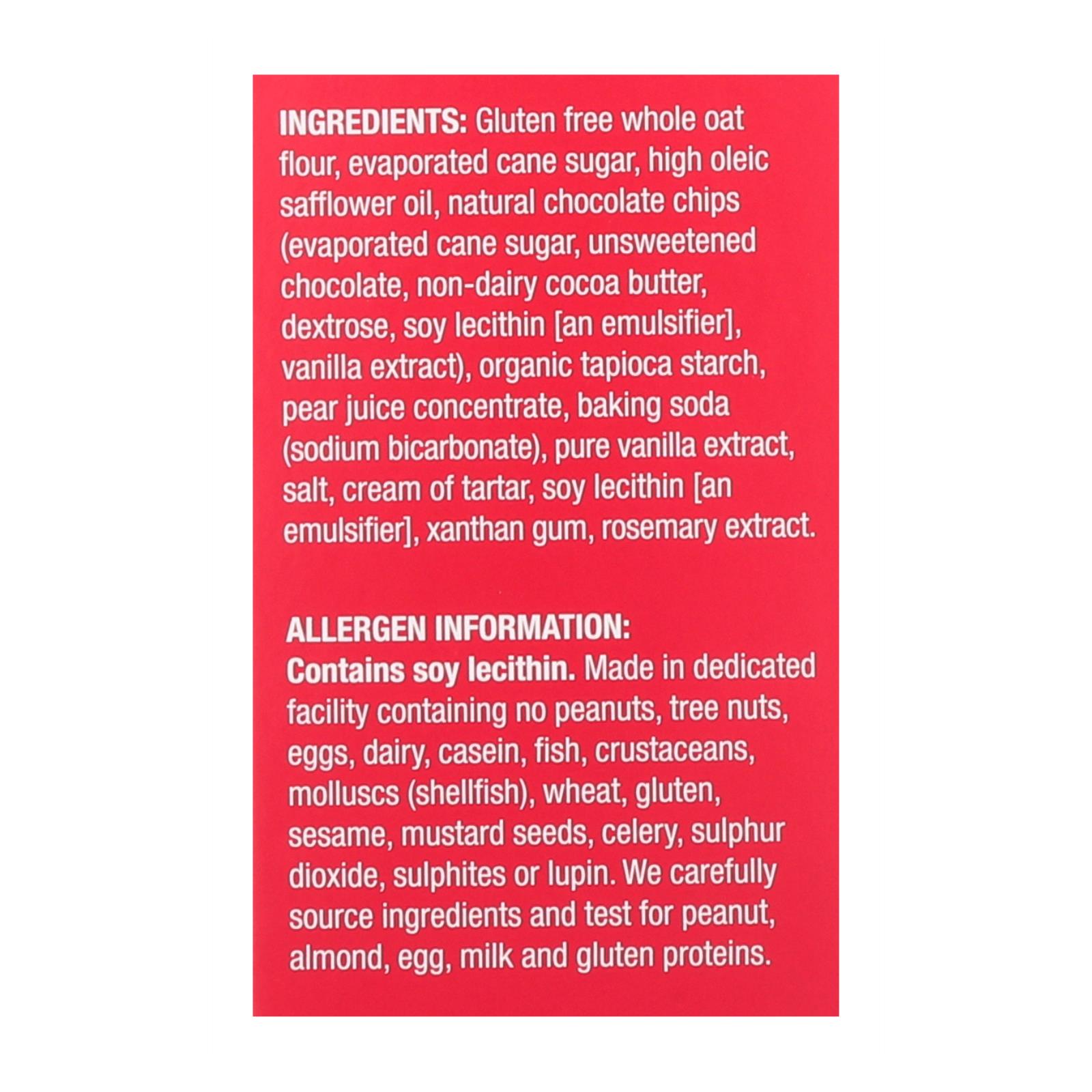 ingredients : gluten free whole oat flour;evaporated cane sugar;high oleic safflower oil;natural chocolate chips;unsweetened chocolate;non-dairy cocoa butter;dextrose;soy lecithin [an emulsifier];vanilla extract;organic tapioca starch;pear juice concentrate;baking soda;sodium bicarbonate;pure vanilla extract;salt;cream of tartar;xanthan gum;rosemary extract