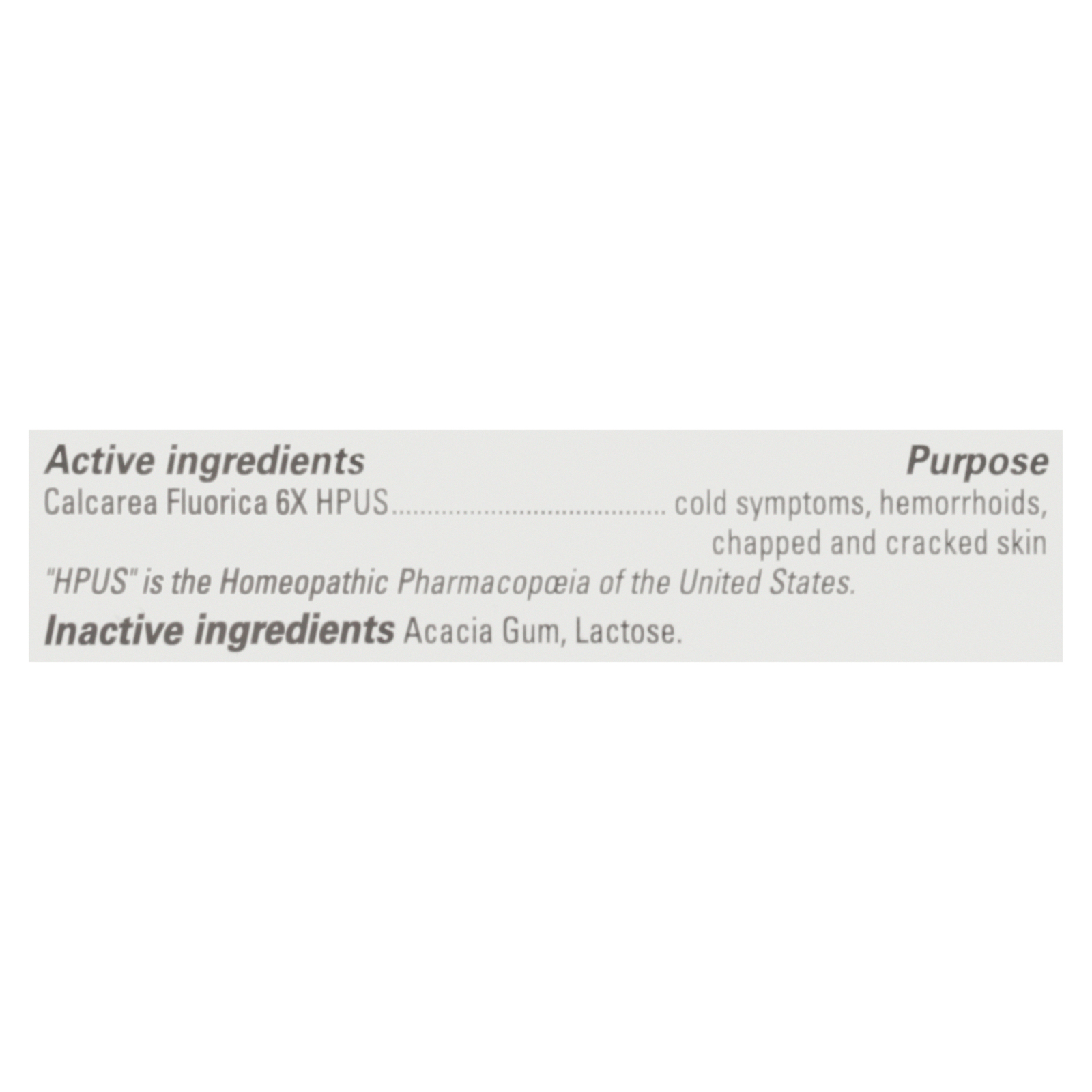 Acacia gum, lactose, Calcarea Fluorica 6x HPUS.