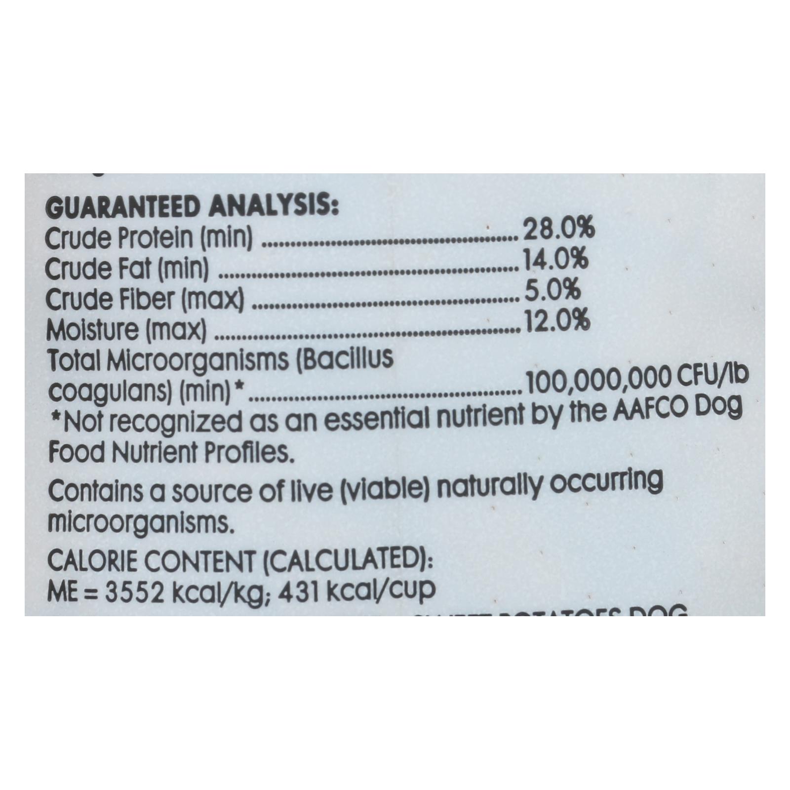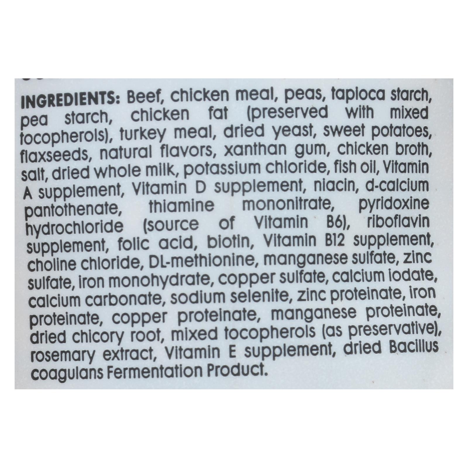 ingredients : beef;chicken meal;peas;tapioca starch;pea starch;chicken fat;preserved with mixed tocopherols;turkey meal;dried yeast;sweet potatoes;flaxseeds;natural flavors;xanthan gum;chicken broth;salt;dried whole milk;potassium chloride;fish oil;vitamin a supplement;vitamin d supplement;niacin;d-calcium pantothenate;thiamine mononitrate;pyridoxine hydrochloride;source of vitamin b6;riboflavin supplement;folic acid;biotin;vitamin b12 supplement;choline chloride;dl-methionine;manganese sulfate;zinc sulfate;i