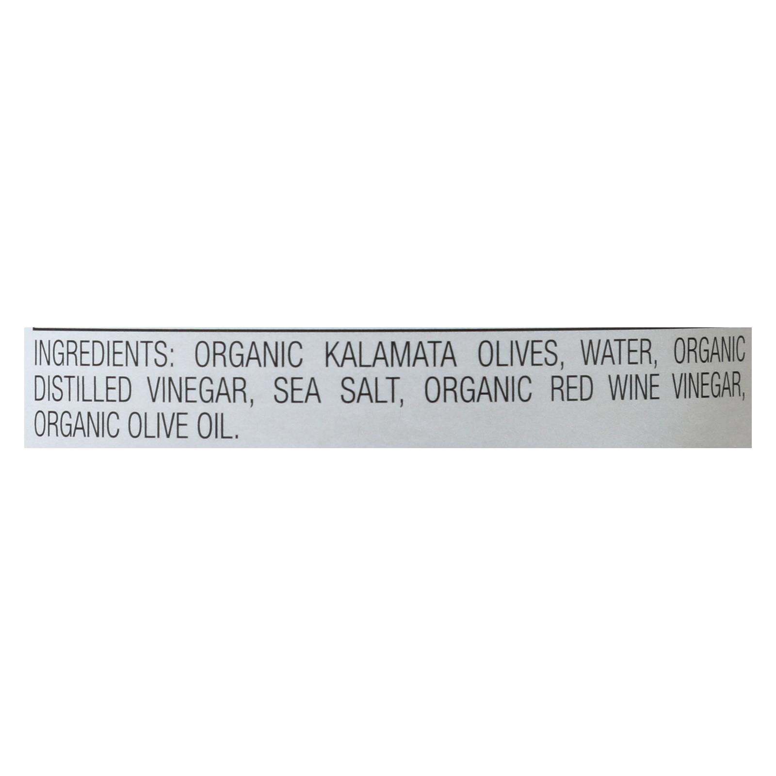 Organic Kalamata olives, water, organic distilled vinegar, sea salt, organic red wine vinegar, organic olive oil.