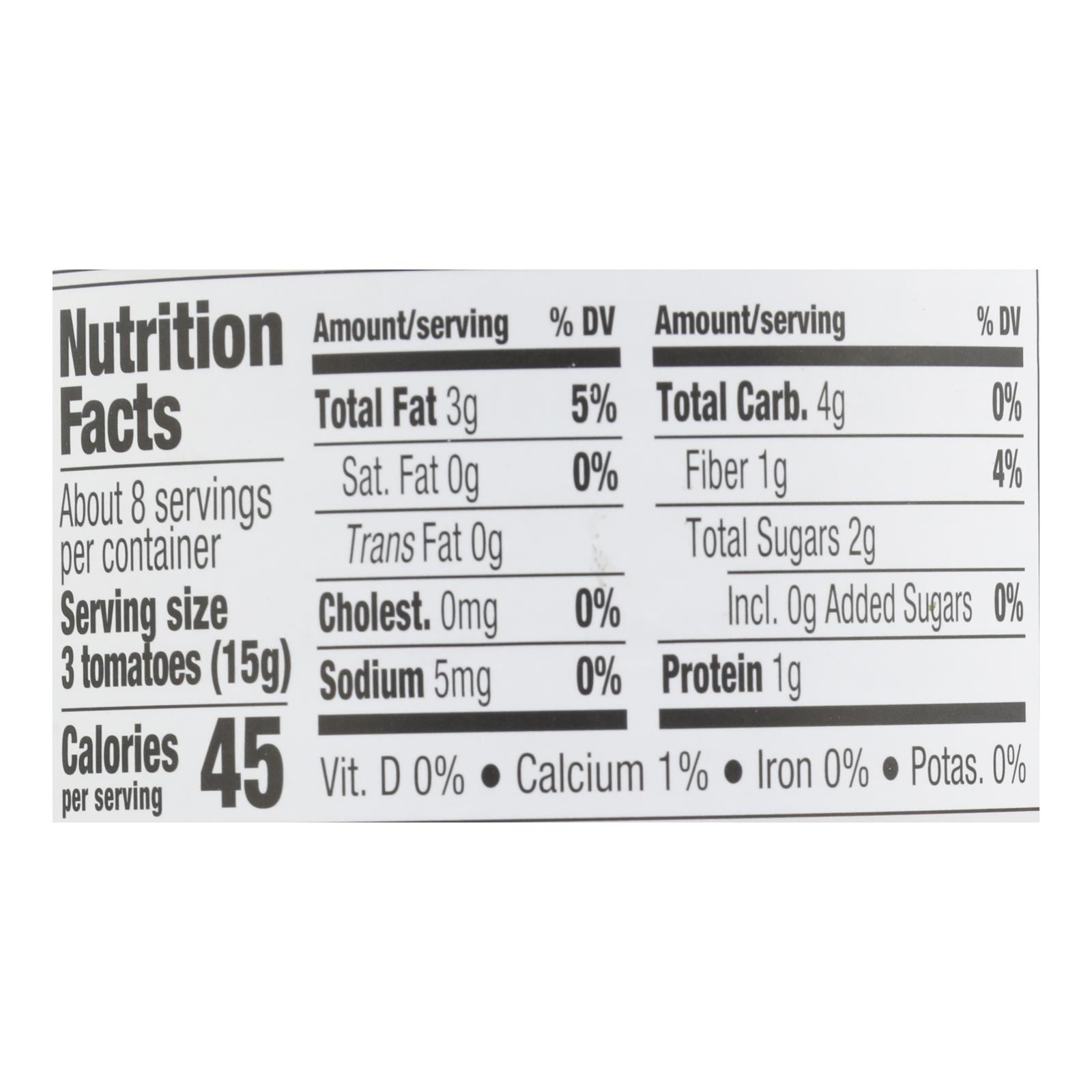 These sun-ripened tomatoes are carefully dried and marinated to preserve their deep, robust flavor-without the use of preservatives. Tomatoes are commonly enjoyed for their naturally occurring antioxidants and have been a staple in wholesome diets for generations. The addition of extra virgin olive oil, garlic, and rosemary extract brings a savory, Mediterranean-inspired touch to every bite.