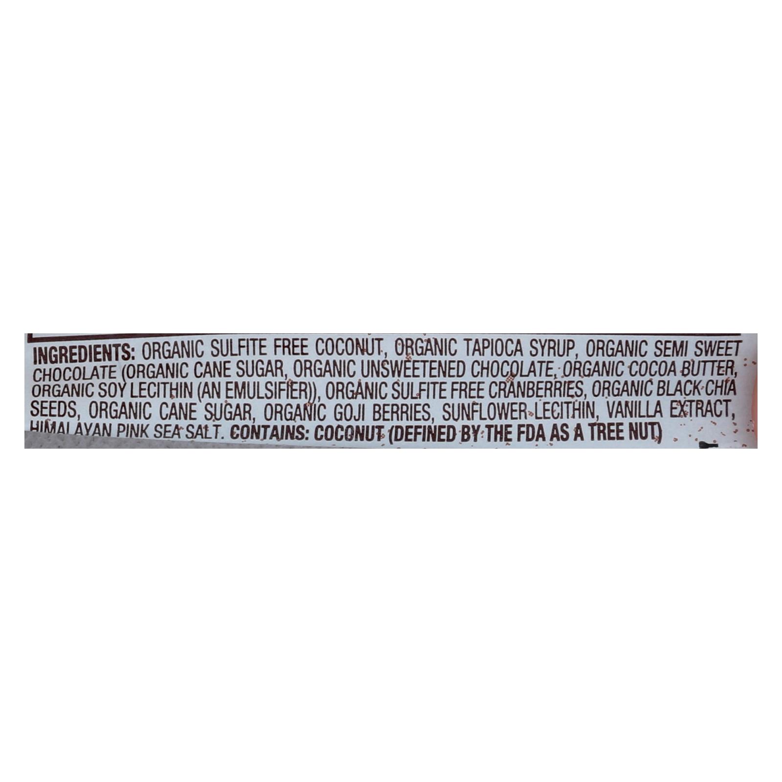 Goji berries, chia seeds, cranberries, chocolate, raw organic coconut.