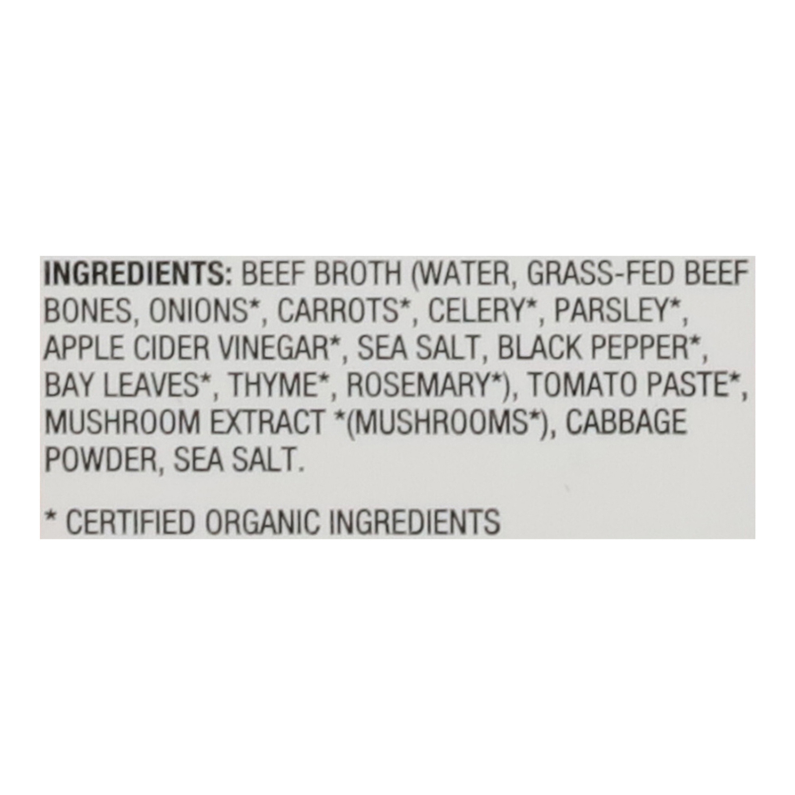 Beef broth (water, grass-fed beef bones, onions*, carrots*, celery*, parsley*, apple cider vinegar*, sea salt, black pepper*, bay leaves*, thyme*, rosemary*); tomato paste; mushroom extract (mushrooms*); cabbage powder; sea salt