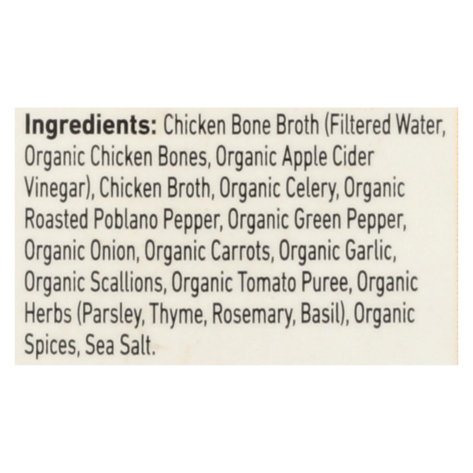 Organic chicken bone broth, water, organic chicken bones, organic onions, organic carrots, organic fennel, organic leeks, organic apple cider vinegar, organic thyme, organic shiitake mushroom, organic tamarind extract, organic bay leaf, vegetable broth (organic celery, organic green pepper, organic onion, organic carrot, organic garlic, organic scallions, organic tomato, organic parsley, organic rosemary, organic basil, organic spices), sea salt.