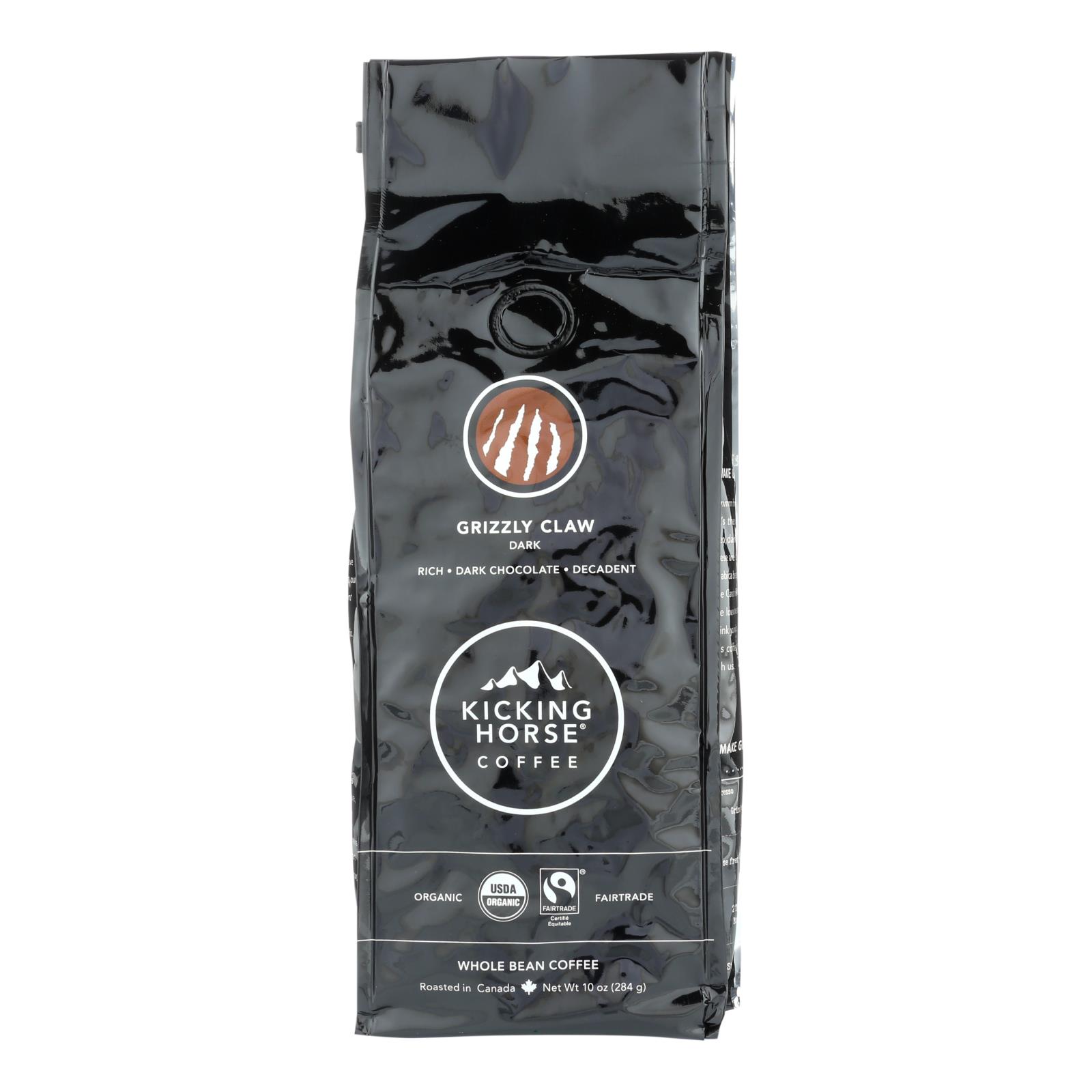 Kicking horse coffee grizzly claw whole bean coffee is a decadent dark roast blend with notes of dark chocolate. Our coffee is sourced from central and south america. These are certified fairtrade arabica beans that are roasted in the rocky mountains. Each 10 oz. Bag of whole bean coffee is certified usda organic.