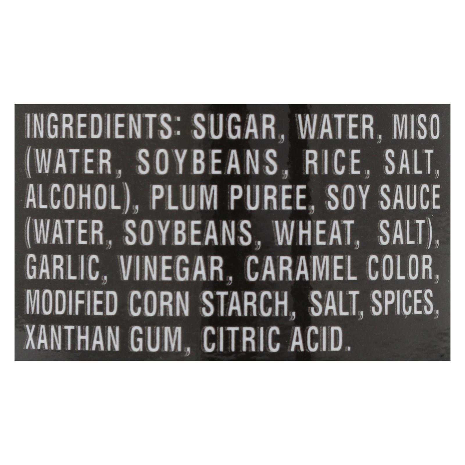 Sugar, water, miso (soybeans, rice, salt, alcohol), plum puree, soy sauce (water, soybeans, wheat, salt), garlic, vinegar, caramel color, modified corn starch, spices, xanthan gum, citric acid.