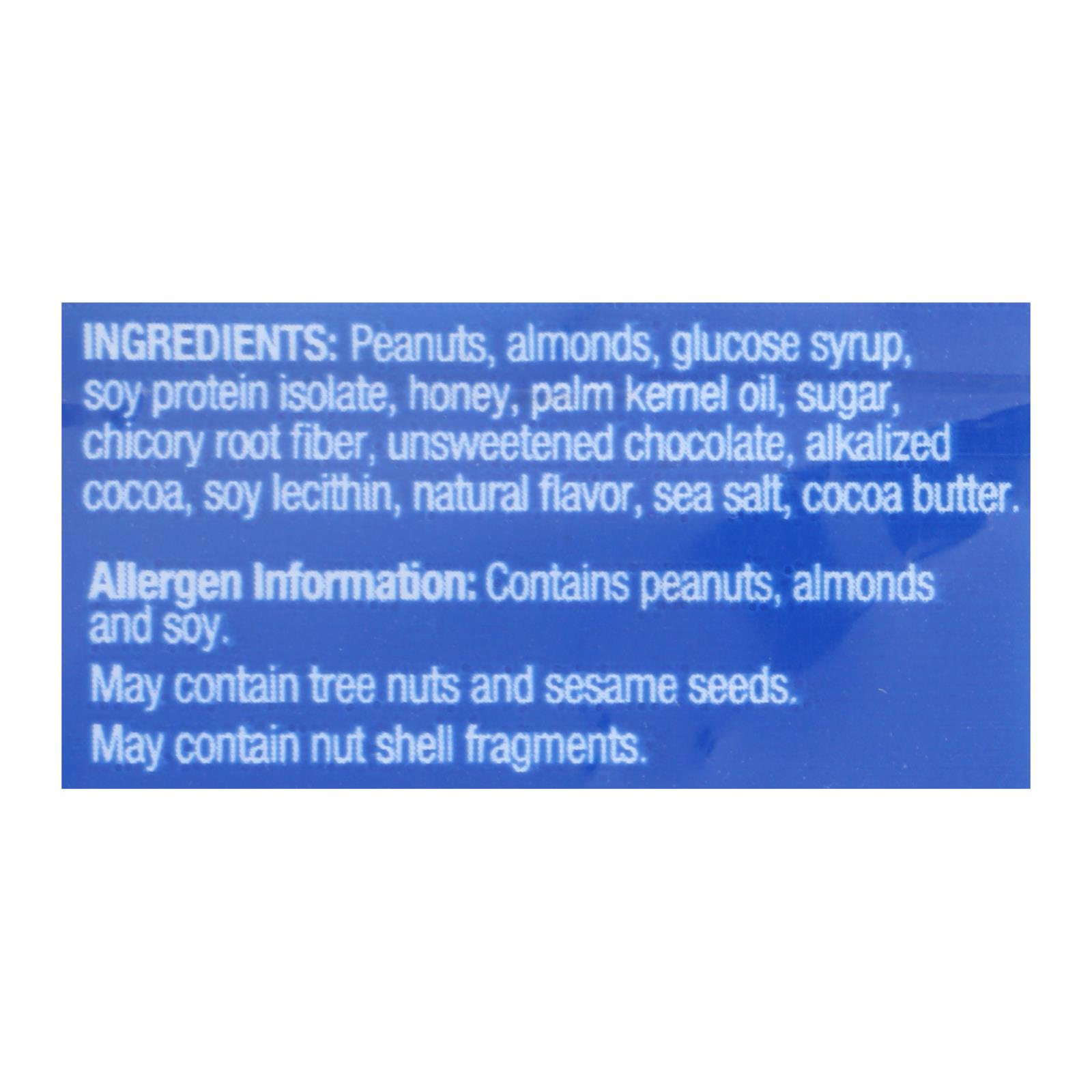 Peanuts, almonds, glucose syrup, soy protein isolate, honey, palm kernel oil, sugar, chicory root fiber, unsweetened chocolate, alkalized cocoa, soy lecithin, natural flavor, sea salt, cocoa butter.