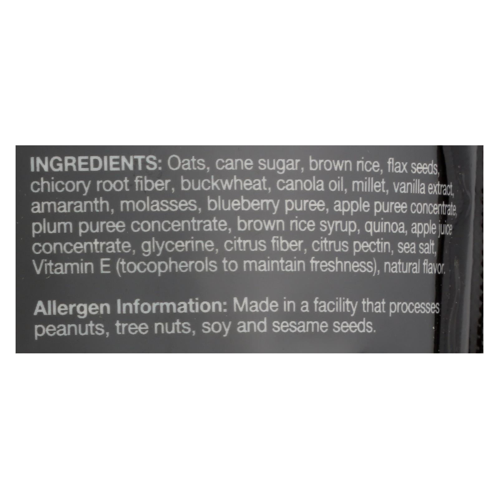 ingredients : oats;cane sugar;brown rice;flax seeds;chicory root fiber;buckwheat;canola oil;millet;vanilla extract;amaranth;molasses;blueberry puree;apple puree concentrate;plum puree concentrate;brown rice syrup;quinoa;apple juice concentrate;glycerine;citrus fiber;citrus pectin;sea salt;vitamin e;tocopherols to maintain freshness;natural flavor