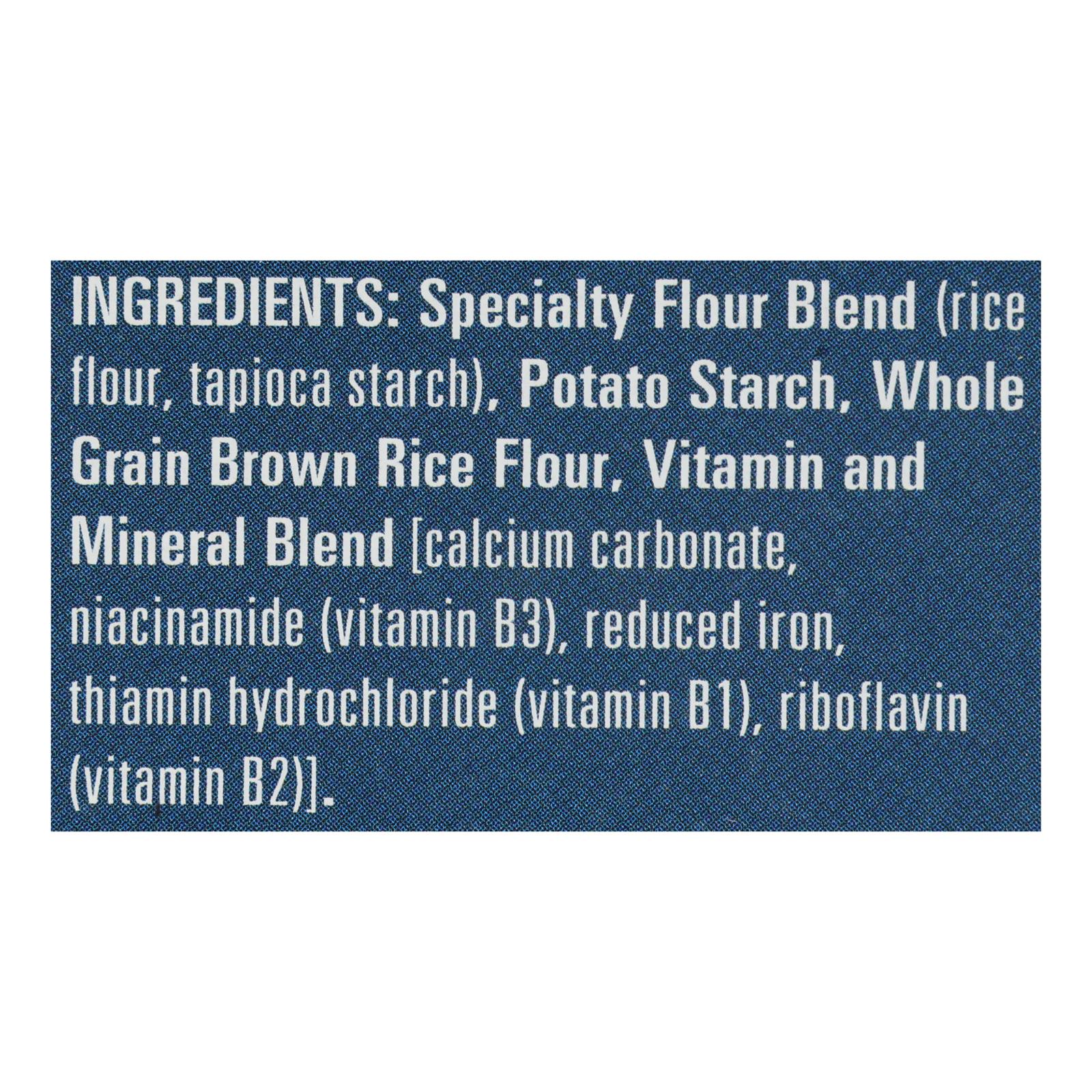 Specialty flour blend (rice flour, tapioca starch), potato starch, whole grain brown rice flour, vitamin and mineral blend (calcium carbonate, niacinamide [vitamin B3], reduced iron, thiamin hydrochloride [vitamin B1], riboflavin [vitamin B2])
