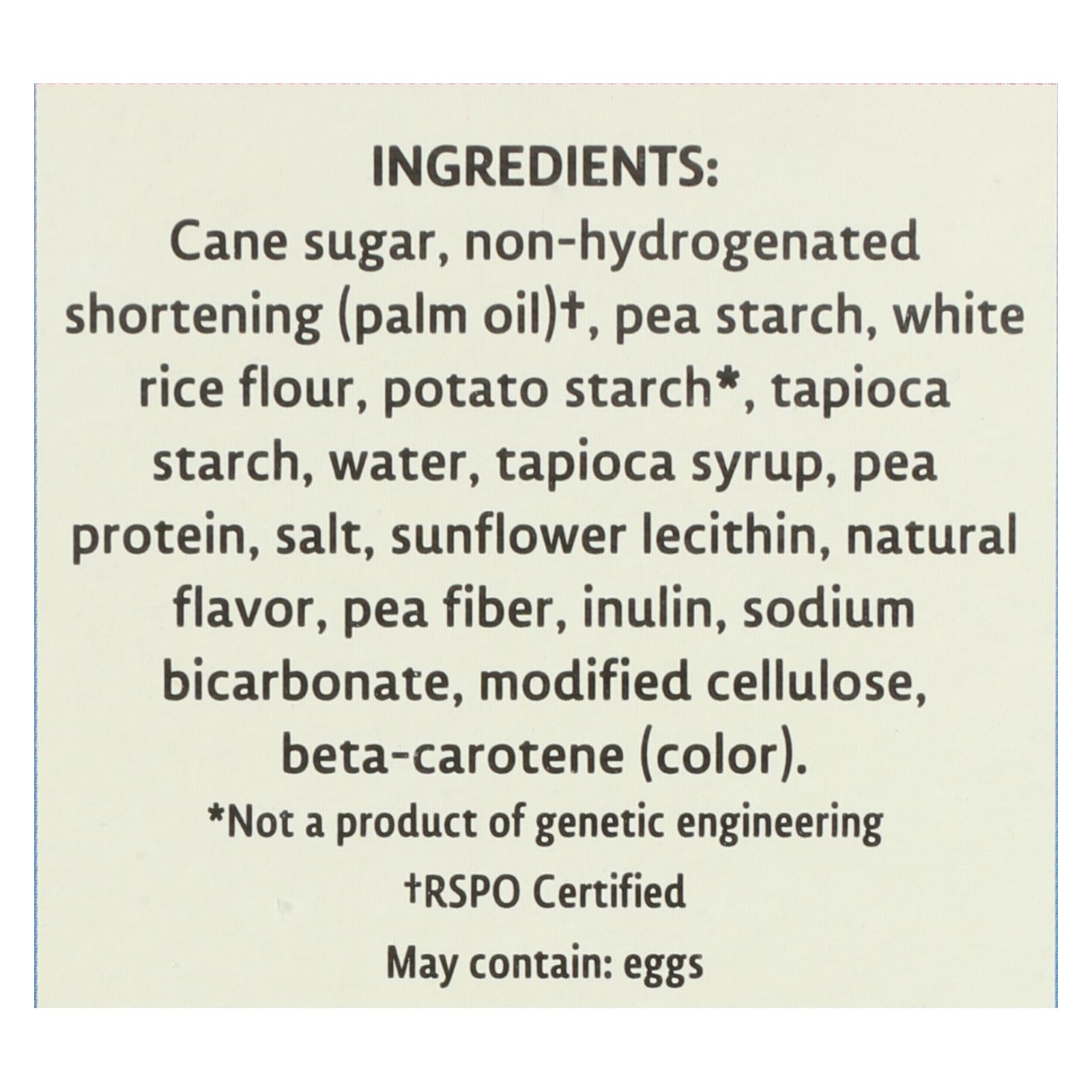 ingredients : cane sugar;non-hydrogenated shortening;palm oil;†;pea starch;white rice flour;potato starch;tapioca starch;water;tapioca syrup;pea protein;salt;sunflower lecithin;natural flavor;pea fiber;inulin;sodium bicarbonate;modified cellulose;beta-carotene;color