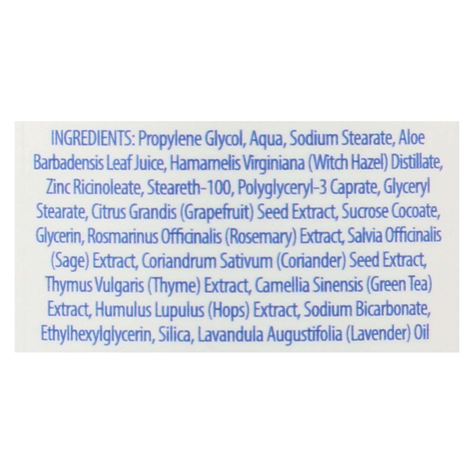 ingredients : propylene glycol;water;sodium stearate;aloe barbadensis;aloe;leaf juice;hamamelis virginiana;witch hazel;distillate;zinc ricinoleate;steareth -100;polyglyceryl-3 caprate;glyceryl stearate;citrus grandis;grapefruit;seed extract;sucrose cocoate;vegetable glycerin;rosmarinus officinalis;rosemary;leaf extract;salvia officinalis;sage;coriandrum sativum;coriander;thymus vulgaris;thyme;camellia sinensis;green tea;humulus lupulus;hops;sodium bicarbonate;ethylhexylglycerin;silica;lavandula angustifolia;l