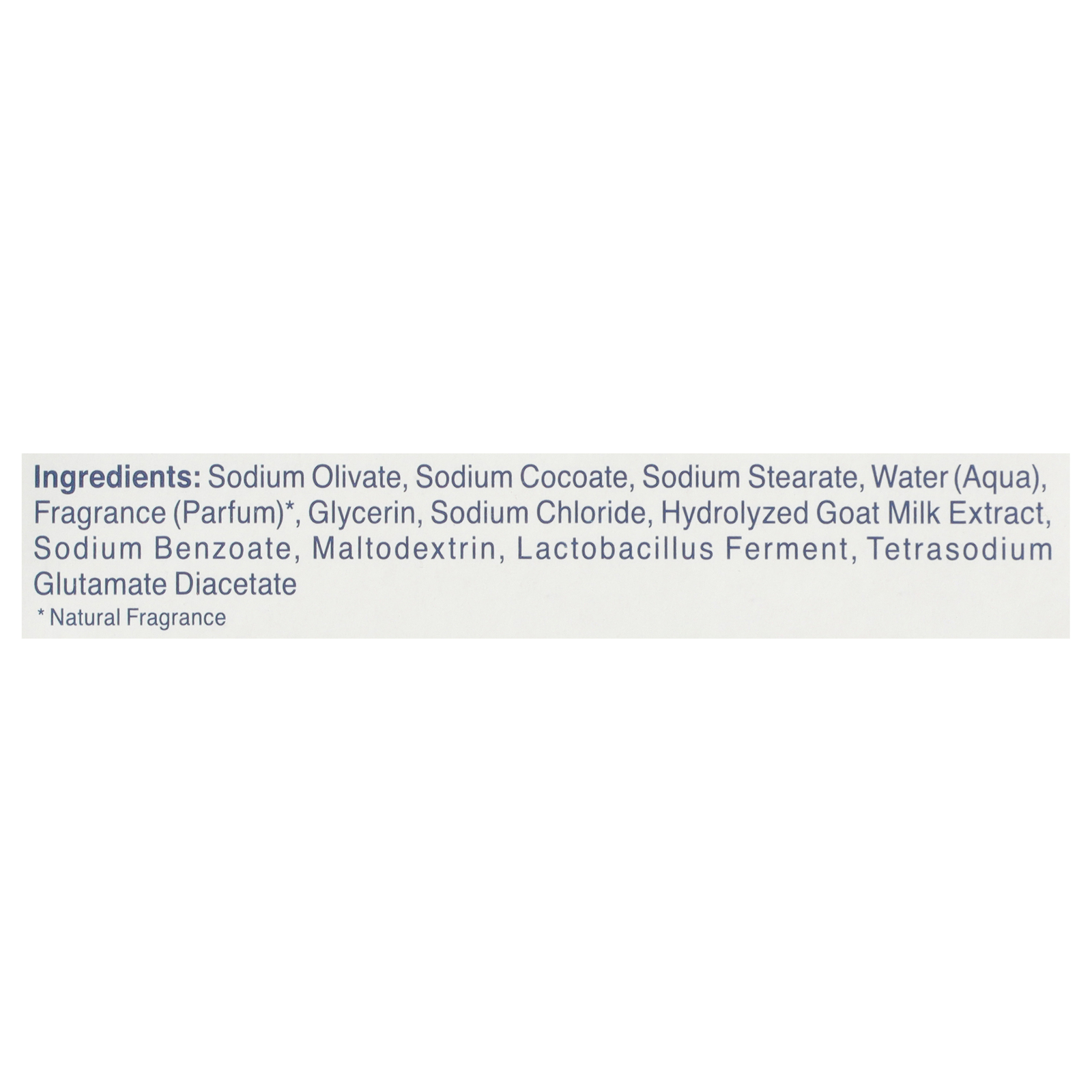 Goat milk, 3xbiotic complex (pre-, pro-, and post-biotics), peach and apple blossom fragrance. Free from palm oil, parabens, sodium lauryl/laureth sulfates, phthalates, mineral oil, artificial colors, and formaldehyde donors.