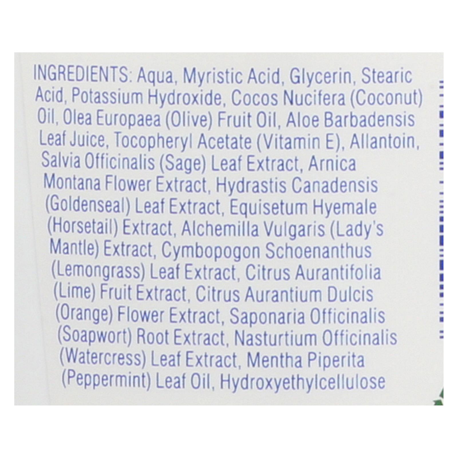 Aqua, myristic acid, glycerin, stearic acid, potassium hydroxide, cocos nucifera (coconut) oil, olea europaea (olive) fruit oil, aloe barbadensis leaf juice, tocopheryl acetate (vitamin E), allantoin, salvia officinalis (sage) leaf extract, arnica montana flower extract, hydrastis canadensis (goldenseal), equisetum hyemale (horsetail) extract, alchemilla vulgaris (lady’s mantle), cymbopogon schoenanthus (lemongrass), citrus aurantifolia (lime) fruit extract, citrus aurantium dulcis (orange) flower extract, saponaria officinalis (soap).