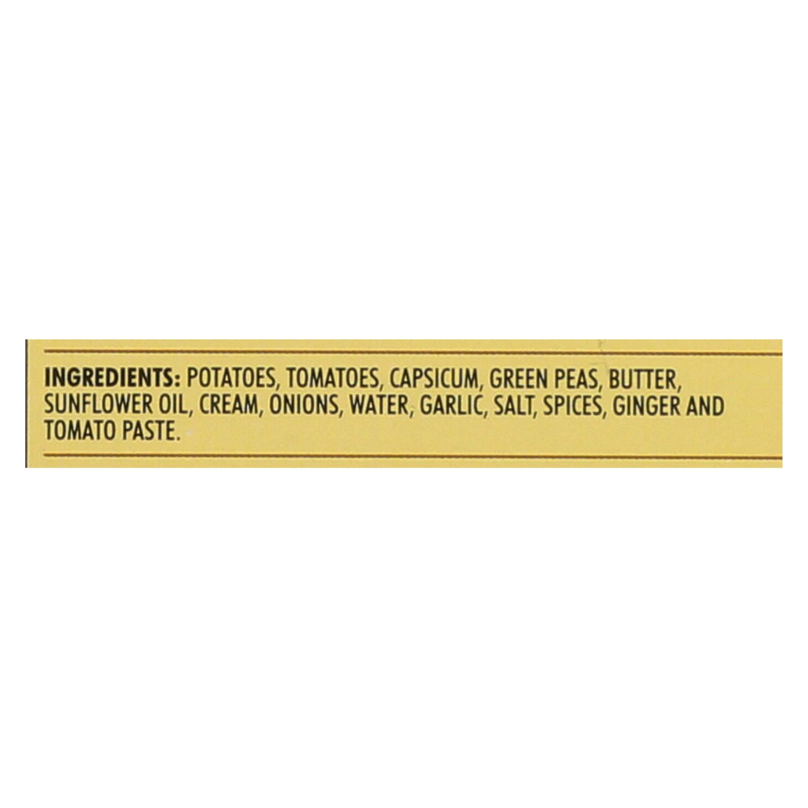 Potatoes, tomatoes, capsicum, green peas, butter, sunflower oil, cream, onions, water, garlic, salt, spices, ginger, and tomato paste.