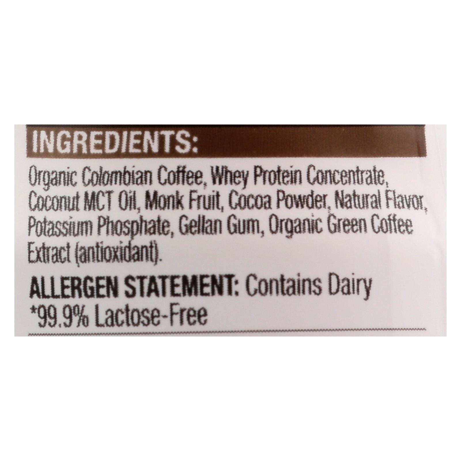 Colombian coffee, milk protein isolate, cocoa powder, MCT oil, natural flavor, potassium phosphate, monk fruit, organic green coffee caffeine, gellan gum.
