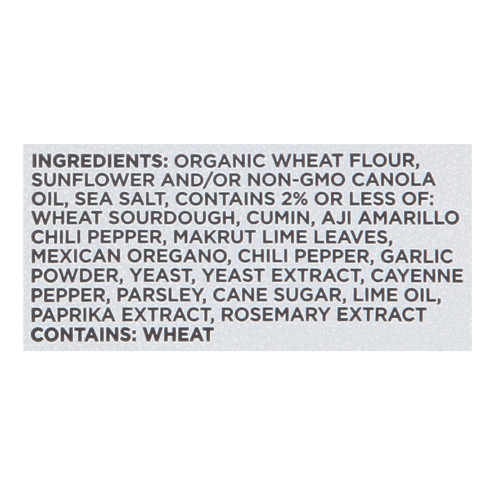 ingredients : organic wheat flour;canola and olive oil [non-gmo canola oil, olive oil, rosemary extract];sea salt;contains 2% or less of: durum wheat sourdough, cumin, aji amarillo chili pepper, makrut lime leaves, mexican oregano, chili pepper, garlic powder, yeast, yeast extract, cayenne pepper, parsley, cane sugar, lime oil, paprika extract