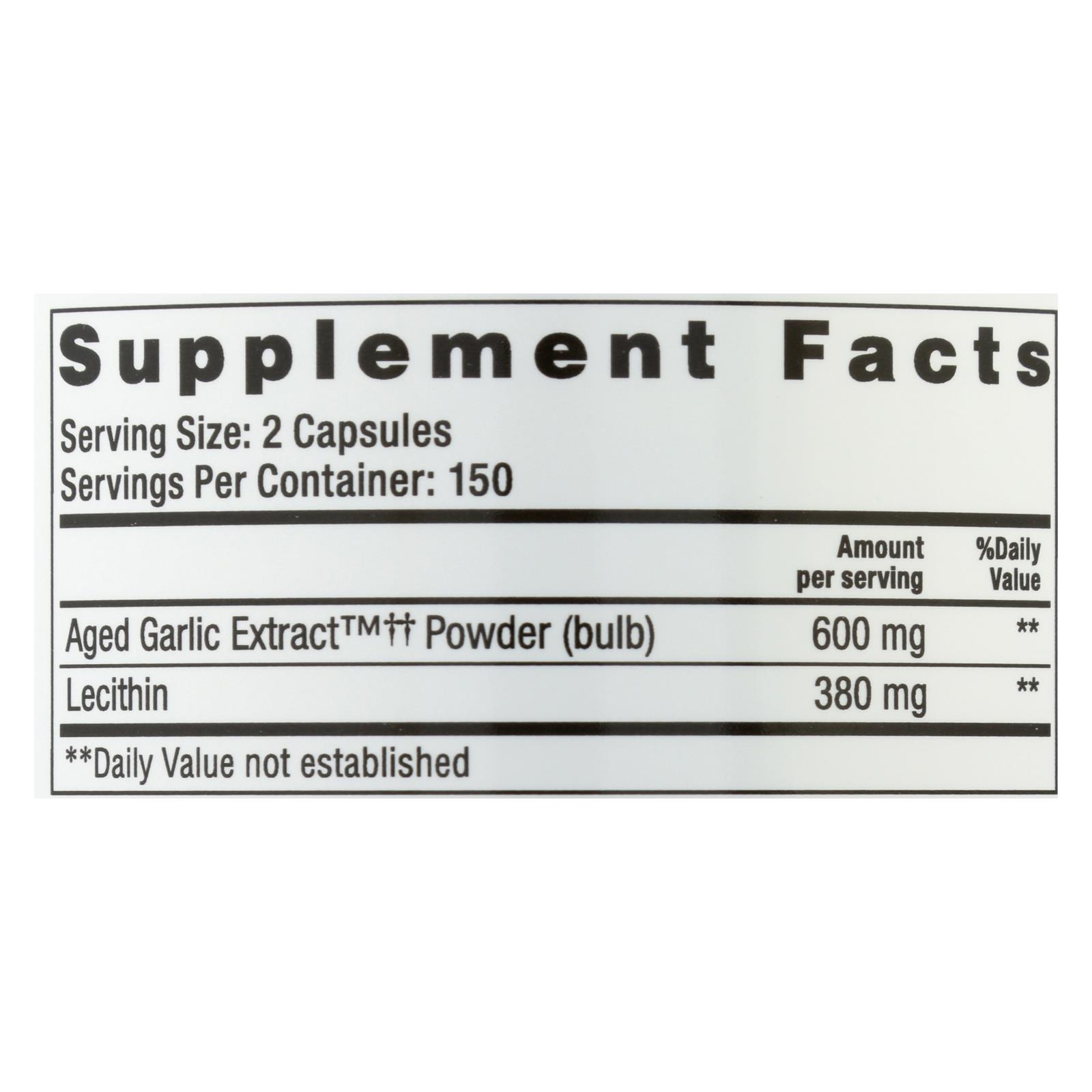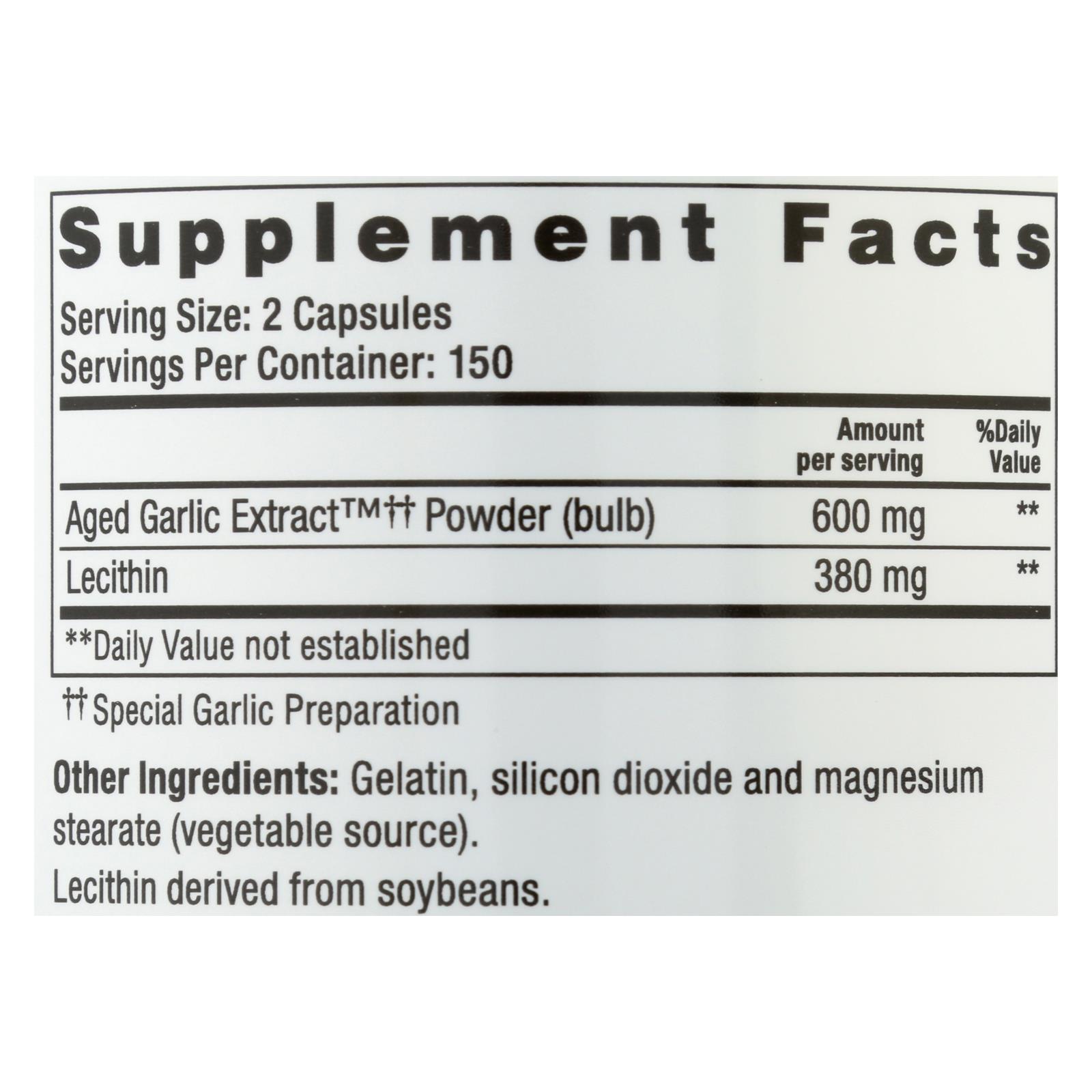 Aged garlic extract (from organically grown garlic bulbs), lecithin. Free of sodium, yeast, and dairy. Gluten free.