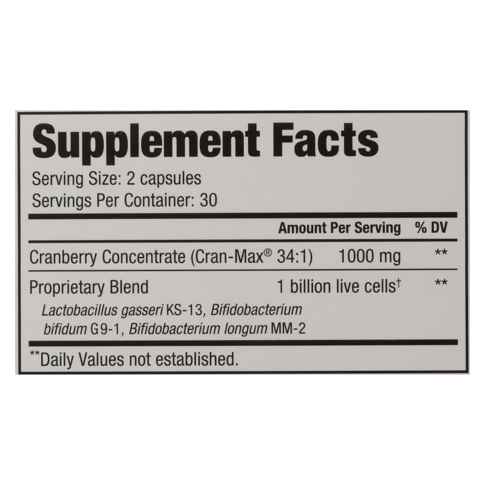 Cran-Max cranberry extract (100% cranberry fruit solids), Kyo-Dophilus probiotics (three essential strains). Free from preservatives, sugar, sodium, dairy, yeast, gluten, artificial colors, and flavors.