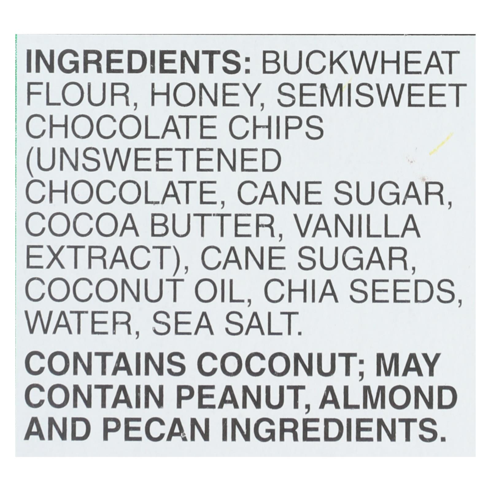 Buckwheat flour, honey, semisweet chocolate chips (unsweetened chocolate, cane sugar, cocoa butter, vanilla extract), cane sugar, coconut oil, chia seeds, water, sea salt.