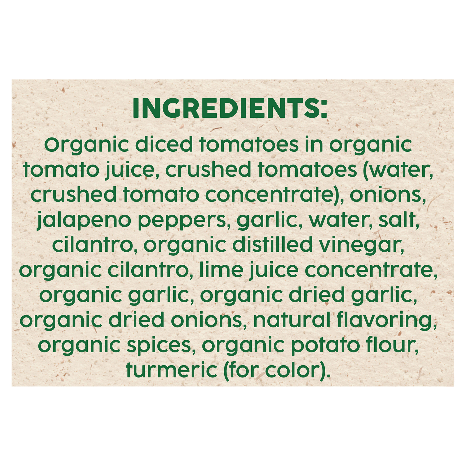 Organic diced tomatoes in organic tomato juice, crushed tomatoes (water, crushed tomato concentrate), onions, jalapeno peppers, garlic, water, salt, cilantro, organic distilled vinegar, organic cilantro, lime juice concentrate, organic garlic, organic dried garlic, organic dried onions, natural flavoring, organic spices, organic potato flour, turmeric (for color).