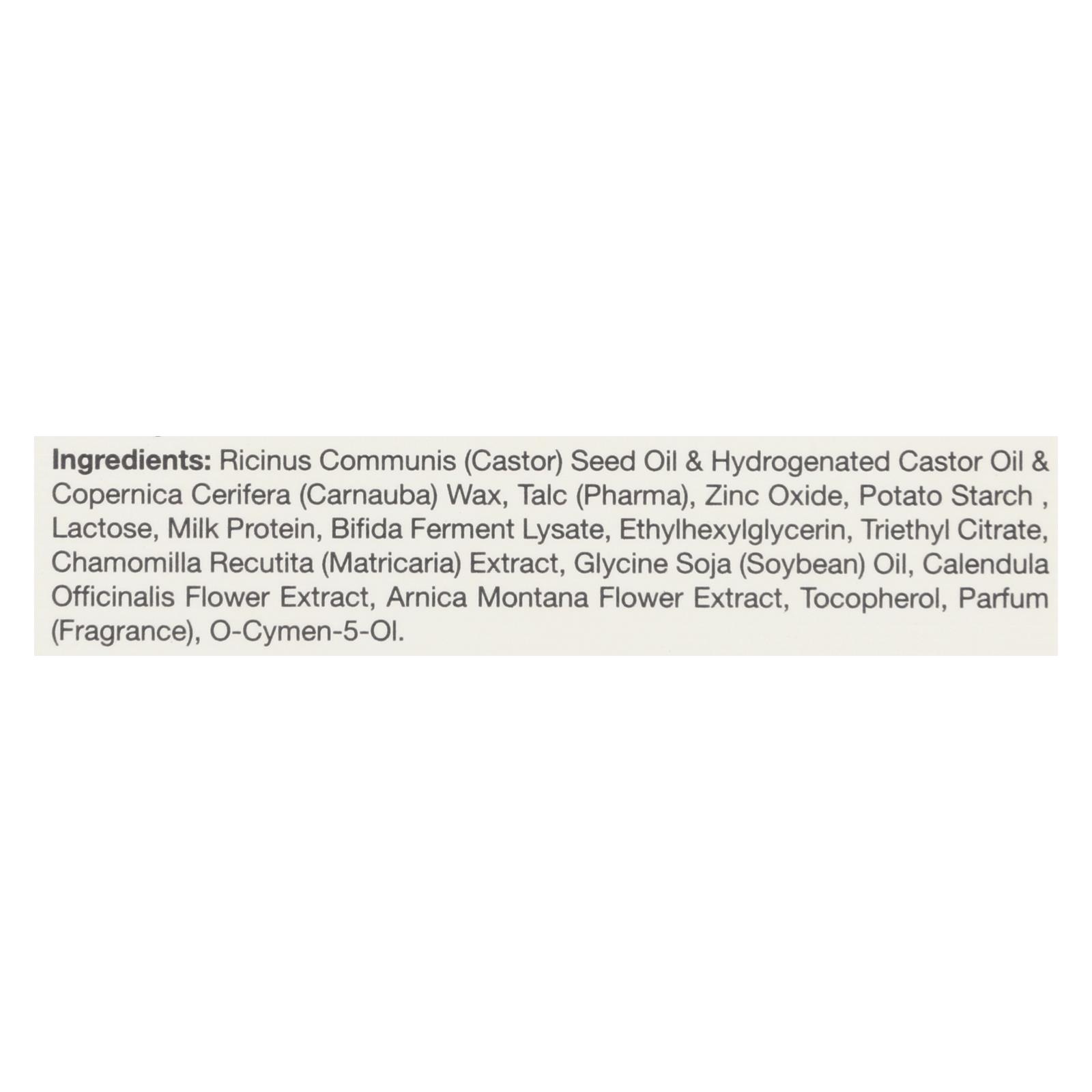 Ricinus communis (castor) seed oil, hydrogenated castor oil, copernica cerifera (carnauba) wax, talc, pharma zinc oxide, potato starch, lactose, milk protein, bifida ferment lysate, ethylhexylglycerin, triethyl citrate, chamomilla recutita (matricaria) extract, glycine soja (soybean) oil, calendula officinalis flower extract, arnica montana flower extract, tocopherol, parfum (fragrance), o-cymen-5-ol.