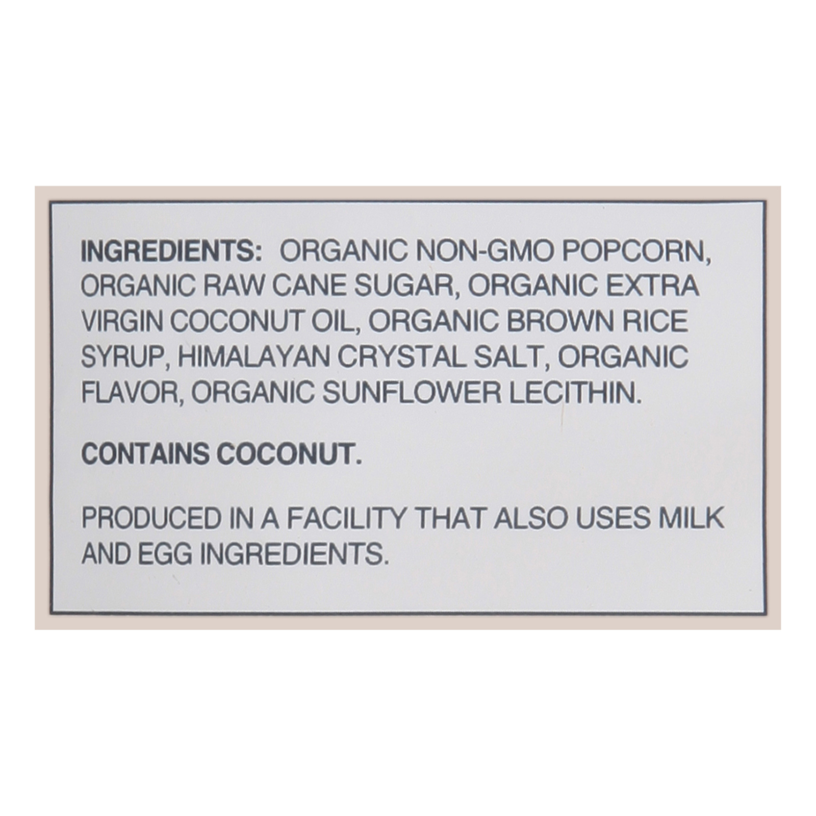 ingredients : organic non-gmo popcorn;organic raw cane sugar;organic extra virgin coconut oil;organic brown rice syrup;himalayan crystal salt;organic flavor;organic sunflower lecithin
