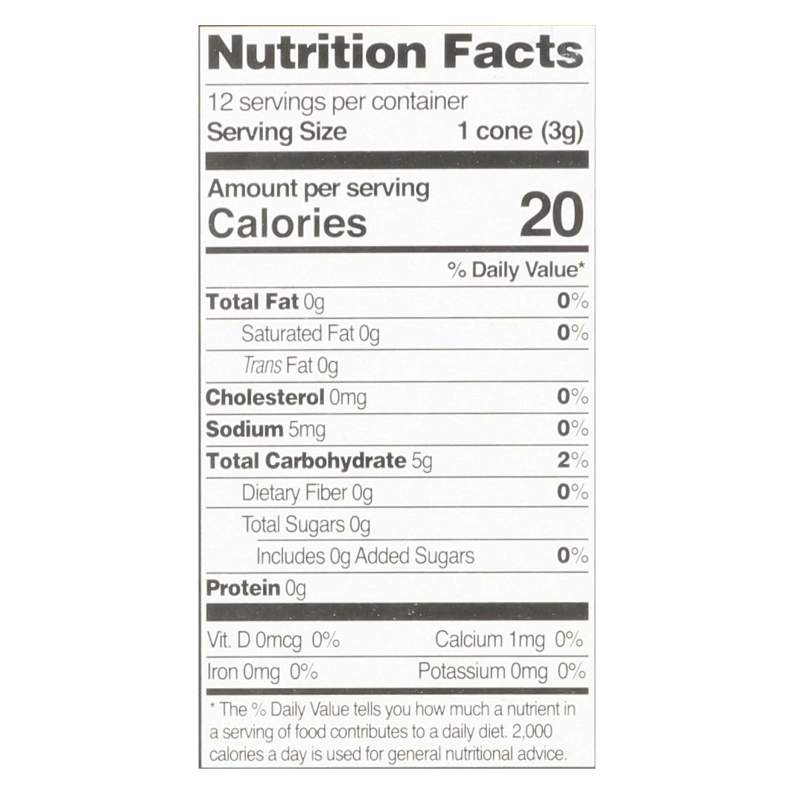 Let’s do… traditional style cake ice cream cones uses ingredients that are non-gmo project verified and orthodox union kosher certified. Our cones are vegan friendly and gluten-free. Included in each 1.2 oz. Box are 12 traditional style cake ice cream cones. Each cone is 20 calories and only has 5 g. Of carbohydrates.