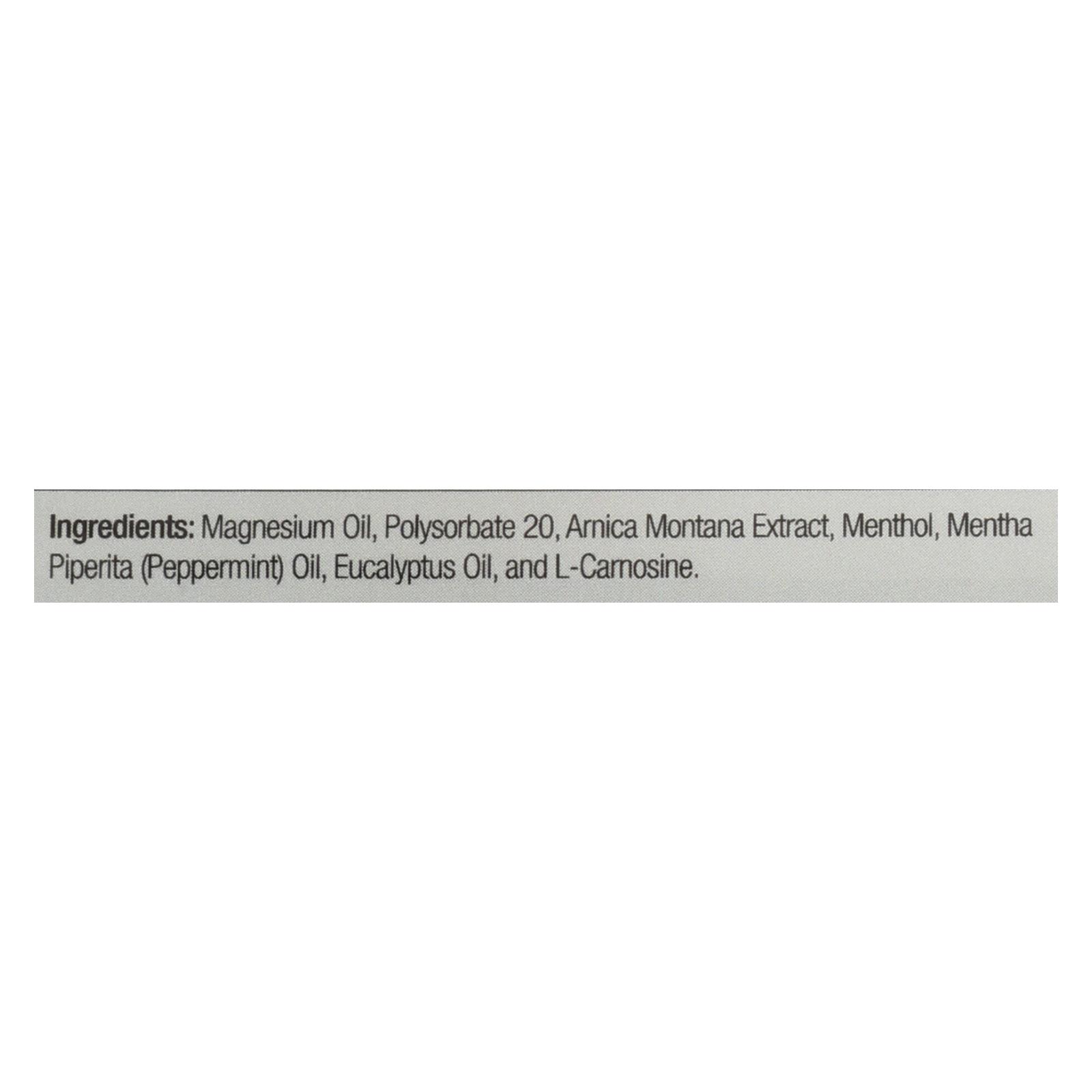 Magnesium oil, polysorbate 20, arnica montana extract, menthol, mentha piperita (peppermint) oil, eucalyptus oil, and L-carnosine.
