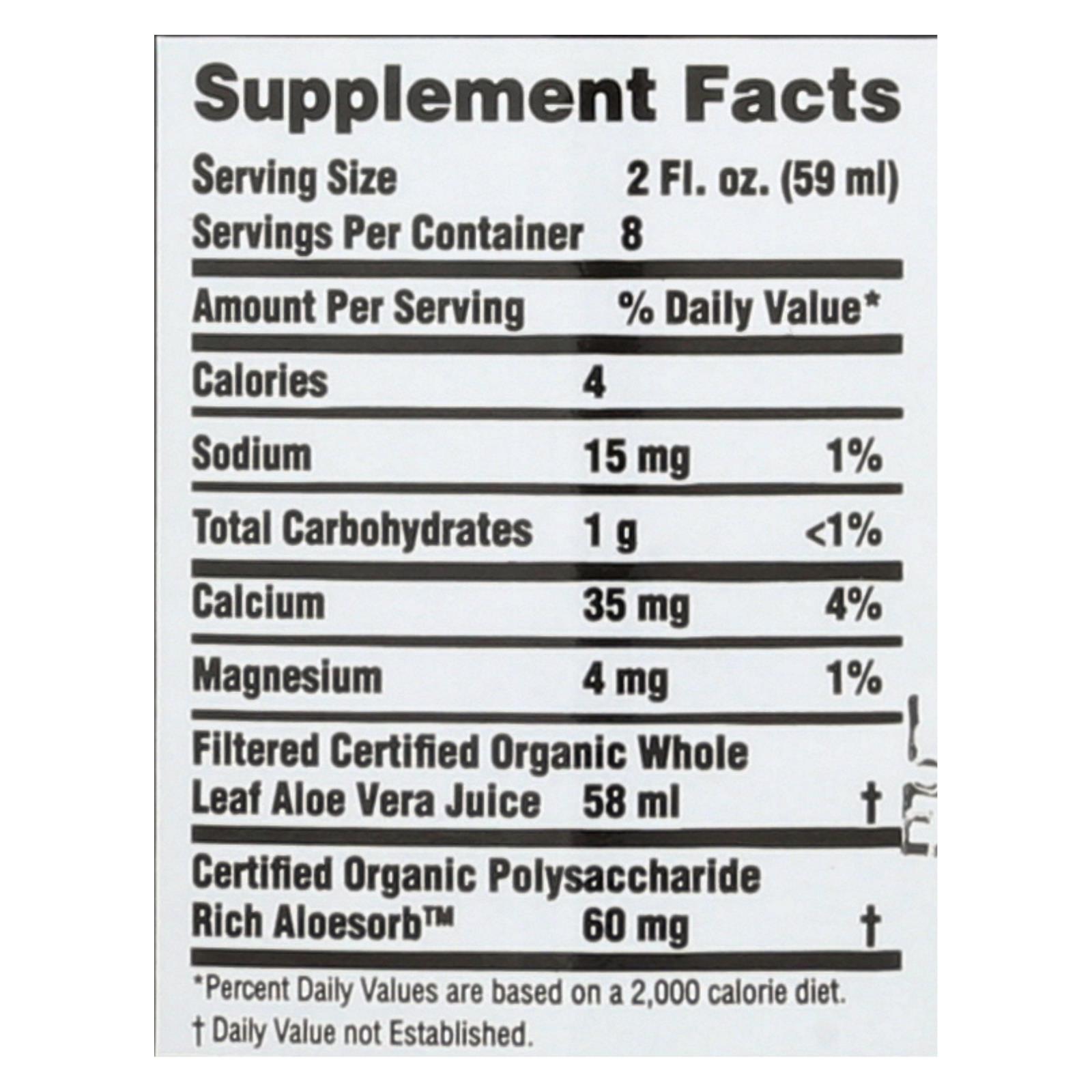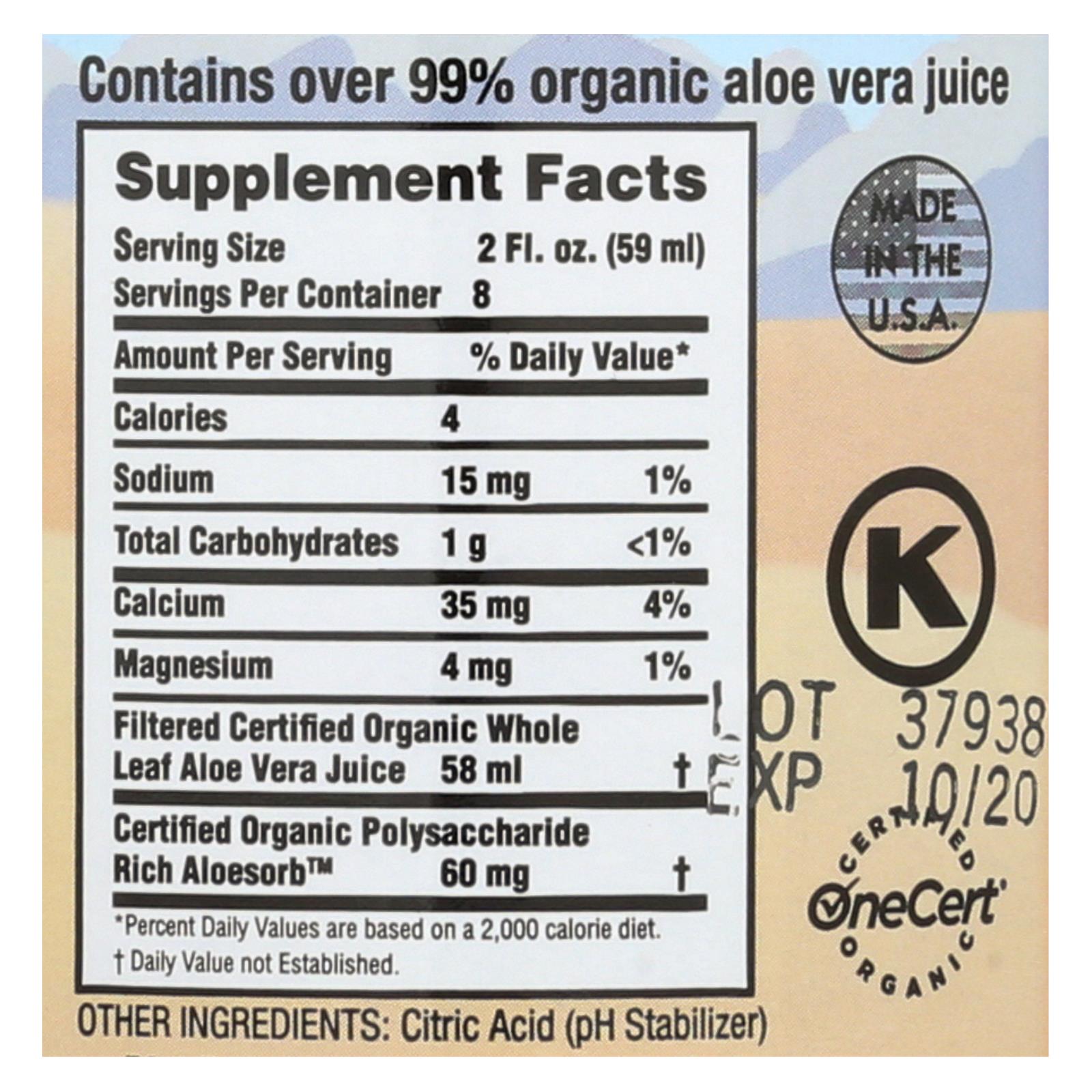 Organic whole leaf aloe vera juice (99%), calcium (35 mg per serving).