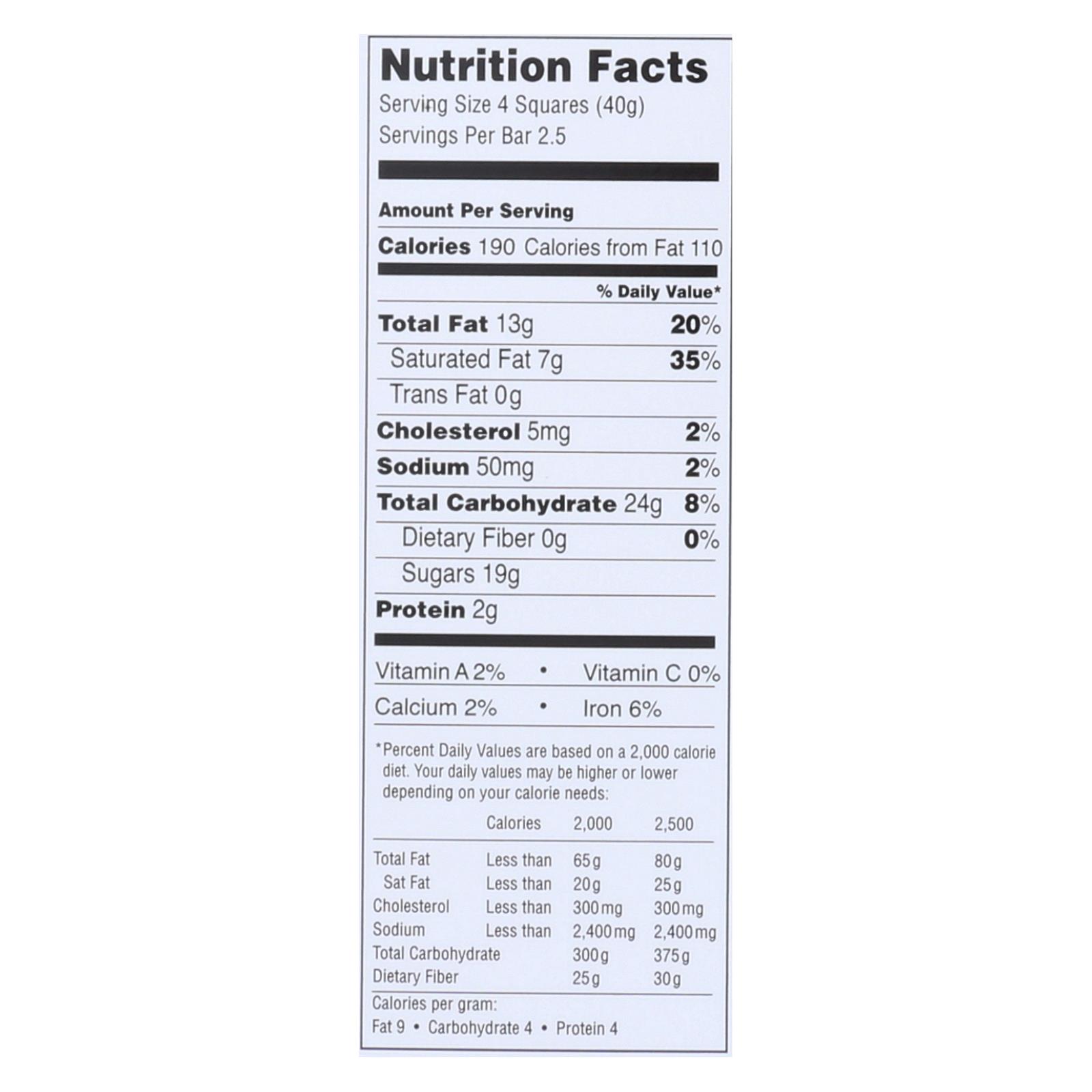 - Serving size: 4 squares (about 2.5 servings per 3.5 oz bar)
