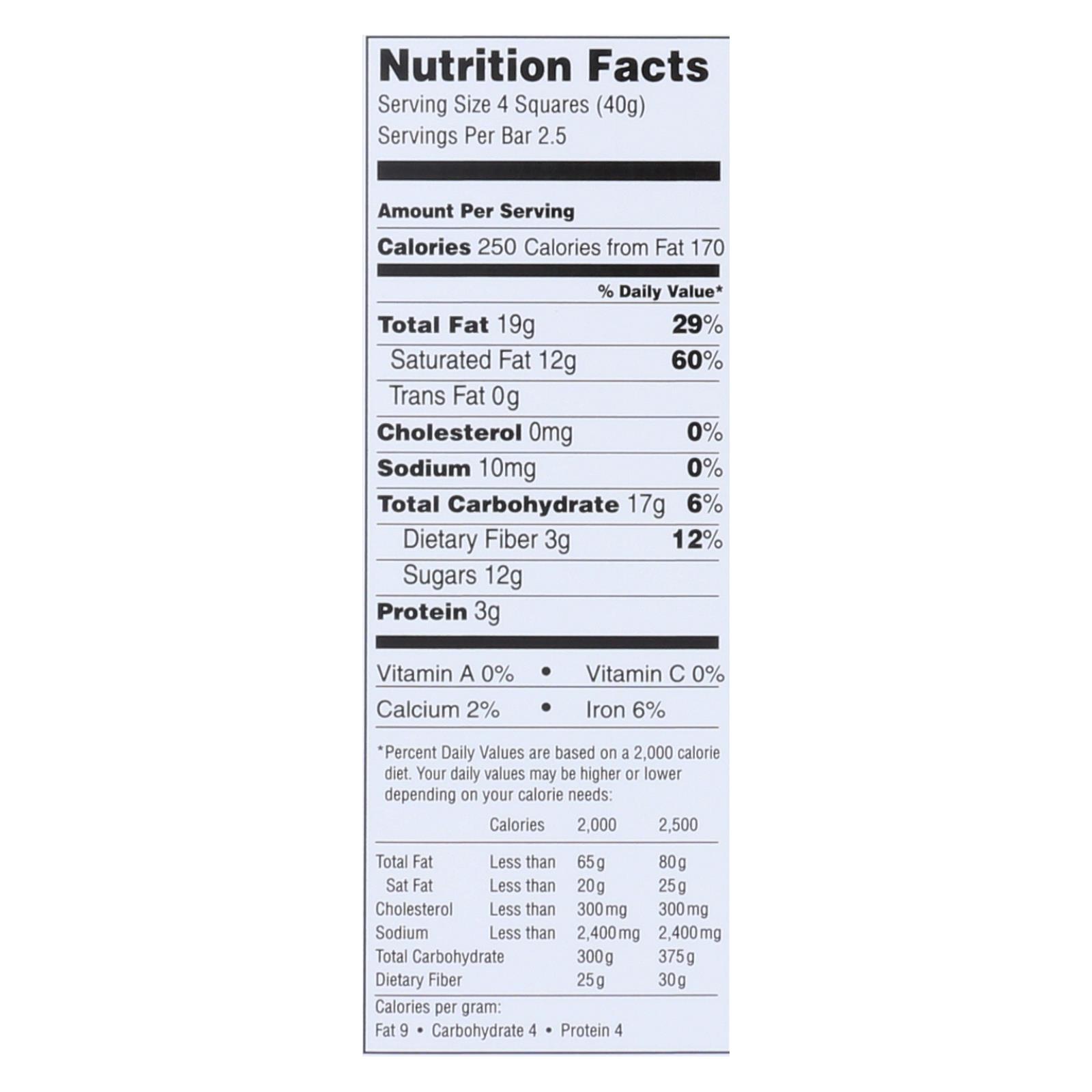 Lindt smooth dark chocolate bar offers a savory 70% cocoa treat. The luxury ingredients include chocolate, cocoa butter, sugar and bourbon vanilla beans. With 4 squares of chocolate as a single serving size, you’ll get about 2.5 servings to this 3.5 oz. Bar. See the nutrition facts panel for allergens.