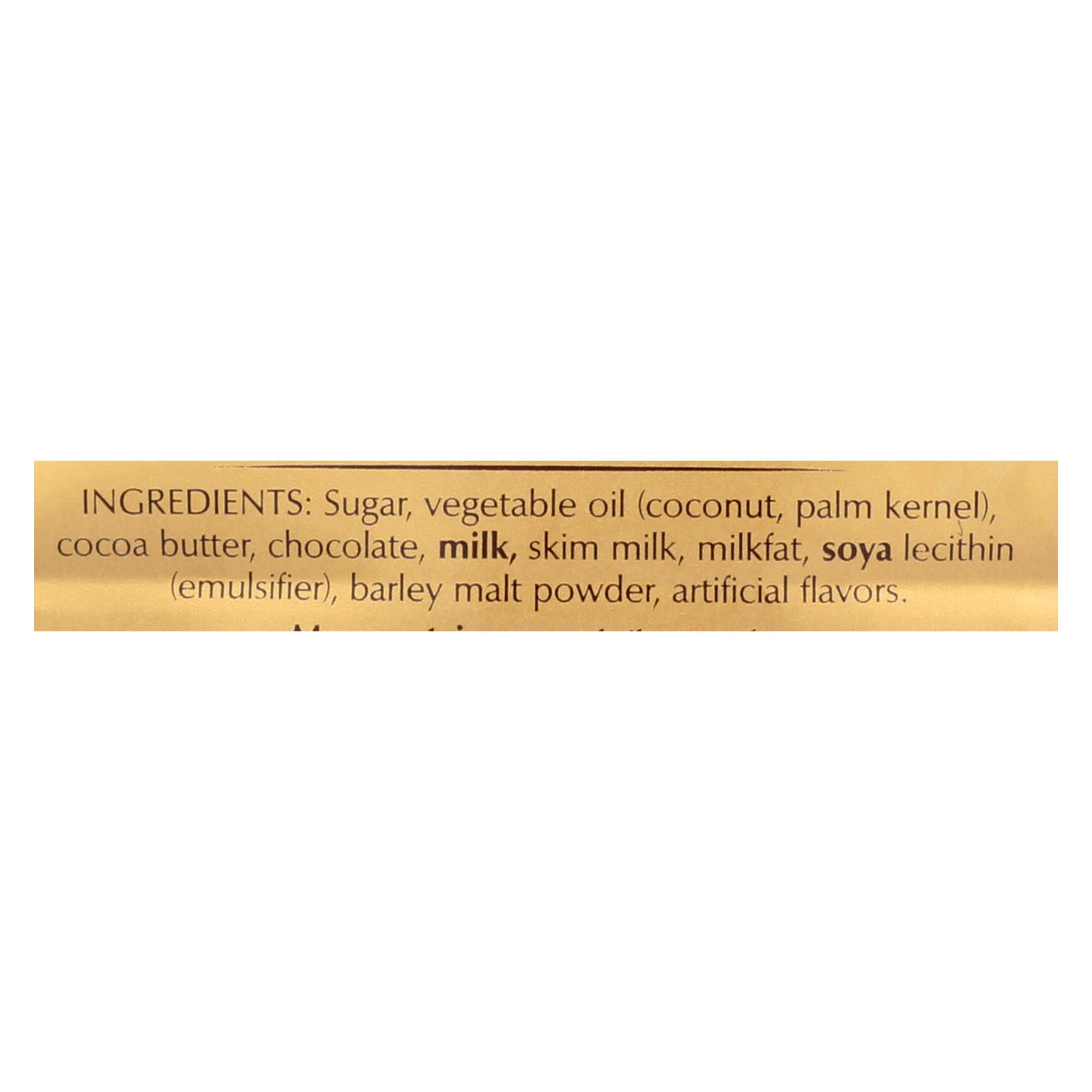 Sugar, vegetable oil (coconut, palm kernel), cocoa butter, chocolate, milk, skim milk, milkfat, soya lecithin (emulsifier), barley malt powder, artificial flavors.