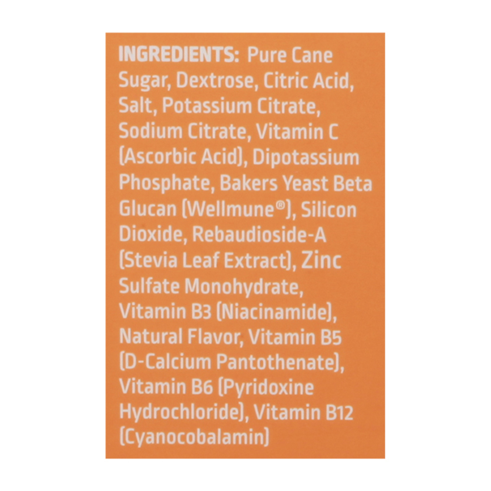 Pure cane sugar, dextrose, citric acid, salt, potassium citrate, sodium citrate, vitamin C (ascorbic acid), dipotassium phosphate, bakers yeast beta glucan (Wellmune®), silicon dioxide, rebaudioside A (stevia leaf extract), zinc sulfate monohydrate, vitamin B3 (niacinamide), natural flavor, vitamin B5 (d-calcium pantothenate), vitamin B6 (pyridoxine hydrochloride), vitamin B12 (cyanocobalamin).