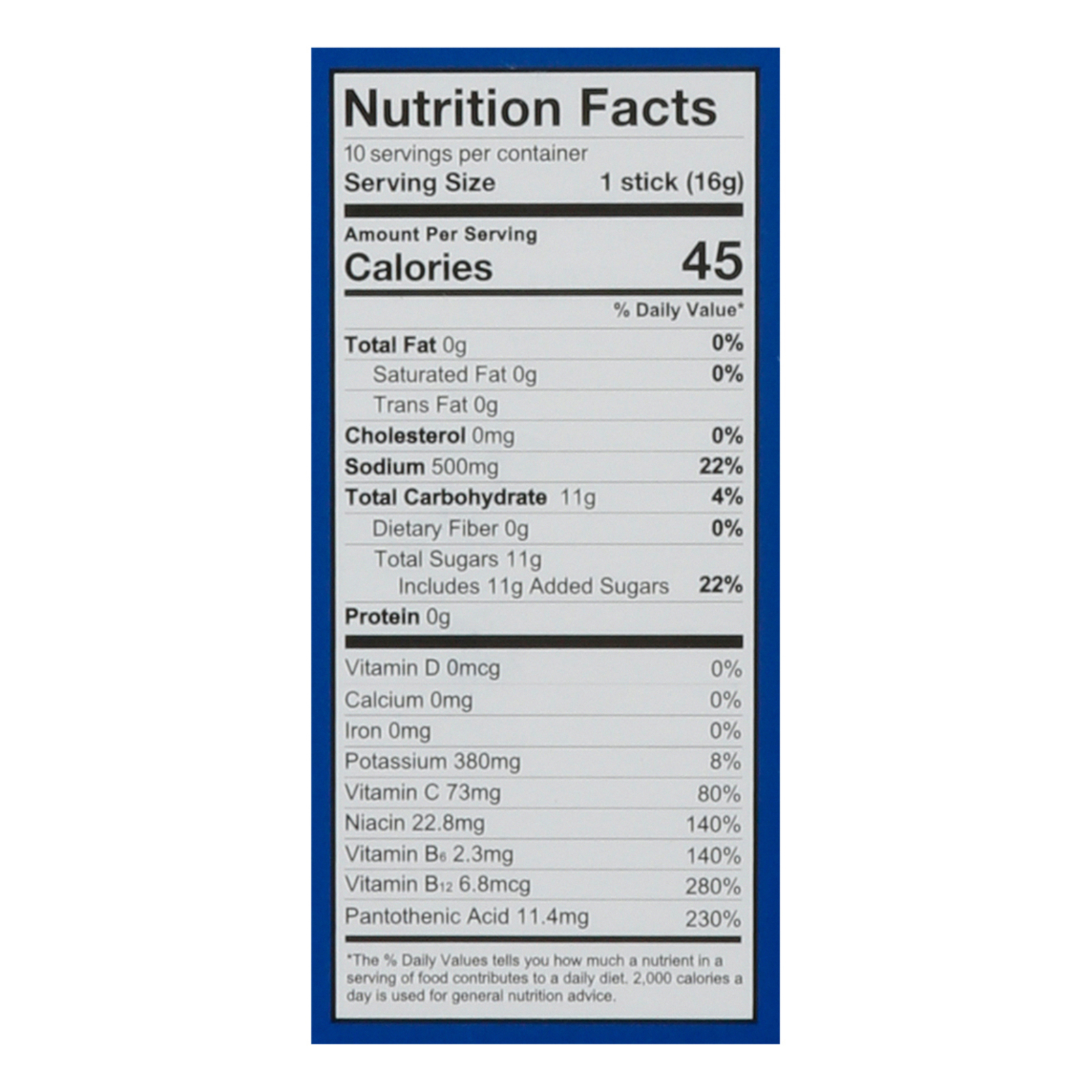 Pure cane sugar, dextrose, citric acid, salt, potassium citrate, sodium citrate, dipotassium phosphate, silicon dioxide, rebaudioside-a (stevia leaf extract), vitamin C (ascorbic acid), natural flavor, vitamin B3 (niacinamide), vitamin B5 (d-calcium pantothenate), vitamin B6 (pyridoxine hydrochloride), vitamin B12 (cyanocobalamin).