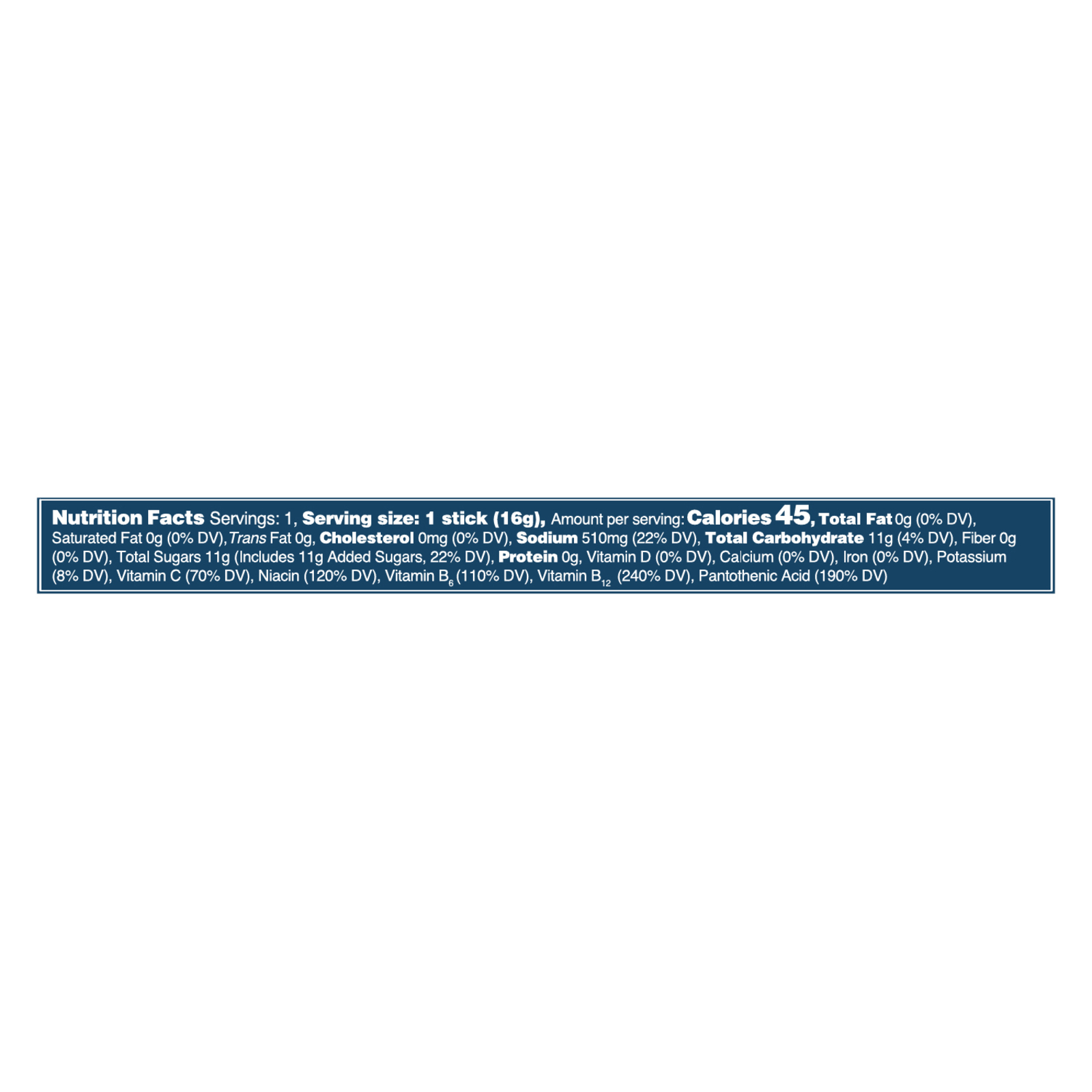 ingredients : pure cane sugar;dextrose;citric acid;salt;potassium citrate;sodium citrate;dipotassium phosphate;silicon dioxide;stevia leaf extract (rebaudioside a);vitamin c (ascorbic acid);natural flavors;vitamin b3 (niacinamide);vitamin b5 (d-calcium pantothenate);vitamin b6 (pyridoxine hydrochloride);vitamin b12 (cyanocobalamin)