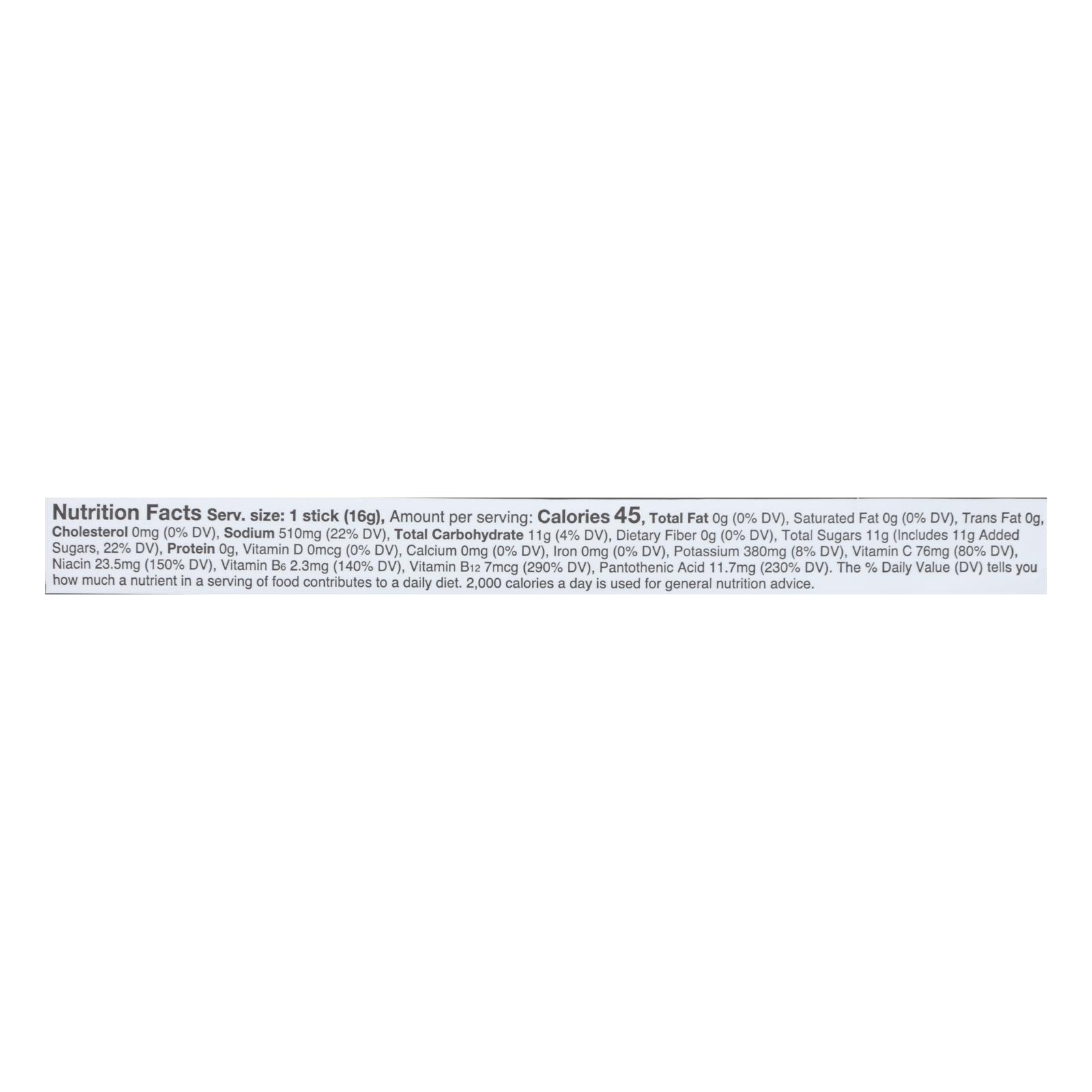 ingredients : pure cane sugar;dextrose;citric acid;salt;potassium citrate;sodium citrate;dipotassium phosphate;silicon dioxide;rebaudioside-a;stevia leaf extract;natural flavors;vitamin c;ascorbic acid;vitamin b3;niacinamide;vitamin b5;d-calcium pantothenate;vitamin b6;pyridoxine hydrochloride;vitamin b12;cyanocobalamin