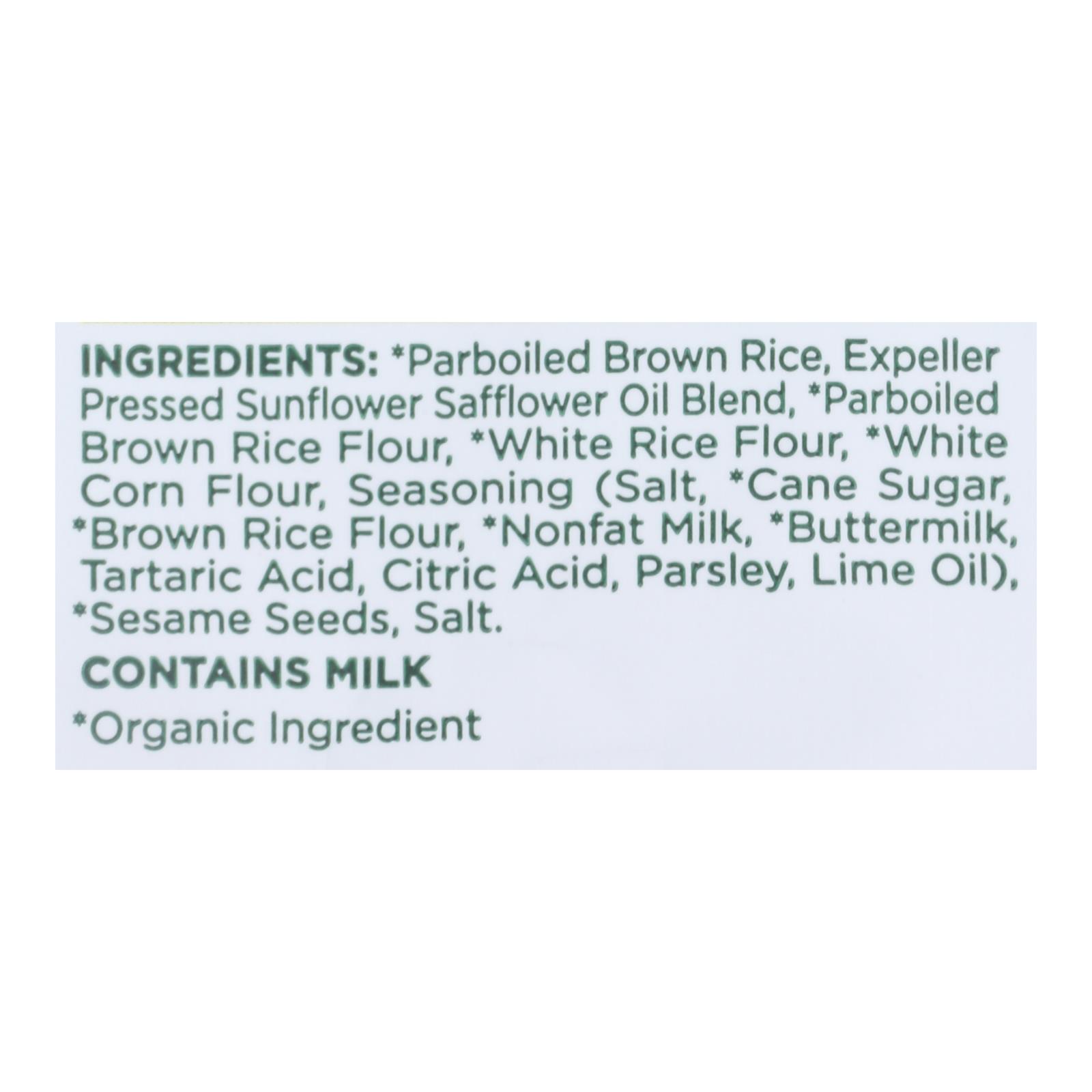Brown rice (whole grain), organic ingredients (70%+), lime flavoring. (Full ingredient list not provided.)