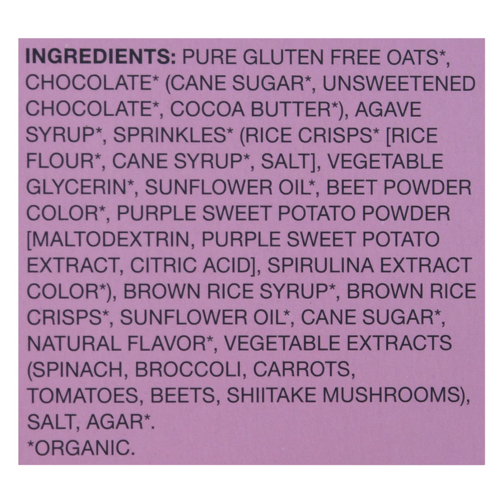 Pure gluten free oats; chocolate* (cane sugar*, unsweetened chocolate*, cocoa butter*); agave syrup; sprinkles* (rice crisps* [rice flour*, cane syrup*, salt], vegetable glycerin*, sunflower oil*, beet powder* [added for color], purple sweet potato powder [added for color] [maltodextrin, purple sweet potato extract, citric acid], spirulina extract* [added for color]); brown rice syrup; invert cane syrup; sunflower oil; brown rice crisps; gluten free oat flour; natural flavor; vegetable extracts (spinach, …)