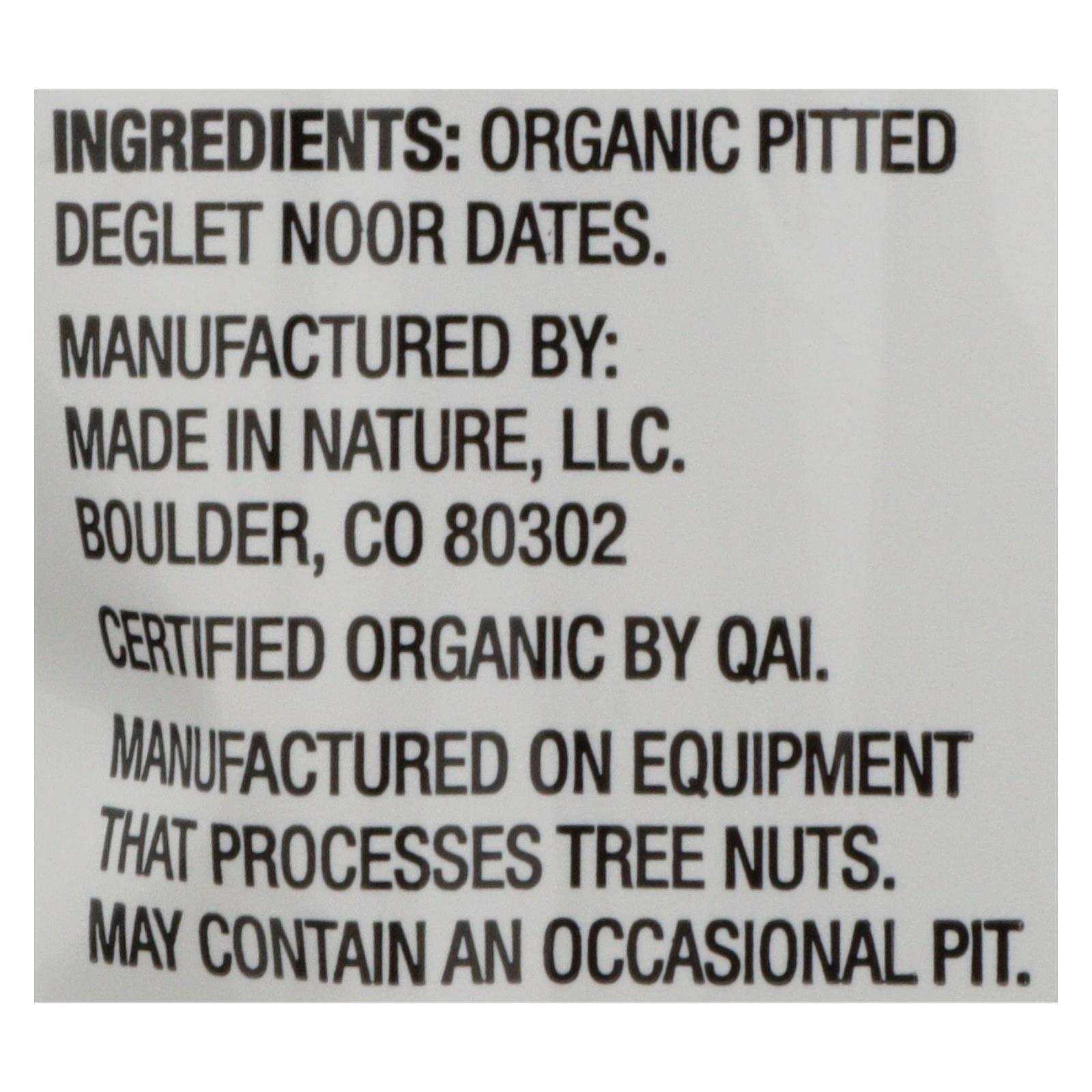 Made In Nature Dates Neglet Noor are 95%+ organic, gluten-free, and non-GMO pitted dates, sold in a convenient case of six 8 oz packs